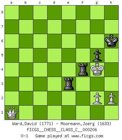 Last move : 0-1 2014 July 18 16:34:0 [Event "FICGS__CHESS__CLASS_C__000206"] [Site "FICGS"] [Date "2013.12.12"] [Round "1"] [White "Ward,David"] [Black "Moormann,Joerg"] [Result "0-1"] [WhiteElo "1771"] [BlackElo "1633"] 1.e4 c5 2.Nf3 d6 3.d4 cxd4 4.Nxd4 Nf6 5.Nc3 a6 6.f3 e5 7.Nb3 Be6 8.Be3 h5 9.Be2 Nbd7 10.Nd5 Bxd5 11.exd5 g6 12.Qd2 Bg7 13.Na5 Qc7 14.c4 e4 15.O-O O-O 16.f4 Ng4 17.Bxg4 hxg4 18.Rad1 f5 19.b4 b6 20.Nc6 Nb8 21.Nd4 Qxc4 22.Ne6 Bc3 23.Qf2 Nd7 24.Rc1 Rf7 25.Qh4 Qxd5 26.Nc7 Qd3 27.Qf2 Ra7 28.Rfd1 Qxd1+ 29.Rxd1 Rxc7 30.Qc2 b5 31.Rxd6 Nf6 32.Qb3 Rc4 33.Rxa6 Kg7 34.a4 Nd5 35.Bc5 e3 36.Re6 Bxb4 37.Bxe3 Nxe3 38.Rxe3 Bc5 39.Kf1 Rxf4+ 40.Ke2 bxa4 41.Qd3 Bxe3 42.Kxe3 Re4+ 43.Kf2 Ra7 44.Qa3 Rae7 45.Qc5 a3 46.Kg3 Kh6 47.Qd6 a2 48.Qf6 Re3+ 49.Kf2 Re2+ 50.Kg3 a1Q 51.Qxa1 R7e3+ 52.Kf4 g5+ 53.Kxf5 Rf2+ 54.Kxg4 Rf4+ 0-1 Sicilian : Najdorf Kingside Castling by player White (move 15) Kingside Castling by player Black (move 15) Promotion Queen by player Black (move 50) 10 pieces endgame at move 51 : White KQPP , Black KRRPPP WHITE : King + 1 Queen 2 Pawns BLACK : King + 2 Rooks 3 Pawns 9 pieces endgame at move 53 : White KQPP , Black KRRPP WHITE : King + 1 Queen 2 Pawns BLACK : King + 2 Rooks 2 Pawns 8 pieces endgame at move 54 : White KQPP , Black KRRP WHITE : King + 1 Queen 2 Pawns BLACK : King + 2 Rooks 1 Pawn Player Black won this chess game. Follow this game move after move (download)The older I grow, the more I value Pawns. (Keres) Bobby Fischer ist kein Vorbild für die heutige Jugend. (Viktor Kortschnoi) Robert Fischer es la ley hacia si mismo. (Larry Evans) Vous n'êtes pas toujours obligé de jouer le meilleur coup. Un coup doit être actif, entreprenant, correct et beau ! (David Bronstein) Secret operations are essential in war; upon them the army relies to make its every move. (Sun Tzu)