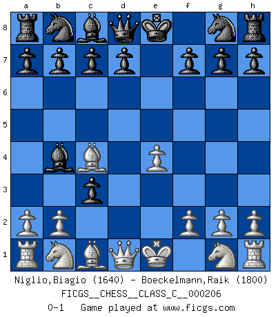 Last move : 0-1 2014 January 24 11:50:21 [Event "FICGS__CHESS__CLASS_C__000206"] [Site "FICGS"] [Date "2013.12.12"] [Round "1"] [White "Niglio,Biagio"] [Black "Boeckelmann,Raik"] [Result "0-1"] [WhiteElo "1640"] [BlackElo "1800"] 1.e4 e5 2.d4 exd4 3.c3 dxc3 4.Bc4 Bb4 0-1 This chess game has been lost on time (started : 2013.12.12 18:29:9) Danish gambit Player Black won this chess game. Follow this game move after move (download)I give 98 percent of my mental energy to Chess. Others give only 2 percent. (Bobby Fischer) Wenn sie aufgeben, dann danke ich Ihnen für das Spiel (Eventualzug beim Fernschach). (Anonymous) Siempre es mucho mejor sacrificar las piezas de tu oponente. (Savielly Tartakover) Mais n'est-ce pas déjà le limiter injurieusement que d'appeler les échecs un jeu? N'est-ce pas aussi une science, un art, ou quelque chose qui, comme le cercueil de Mahomet entre ciel et terre, est suspendu entre l'un et l'autre, et qui réunit un nombre incroyable de contraires ? (Stefan Zweig) The question of whether computers can think is just like question of whether submarines can swim. (Edsger W. Dijkstra)