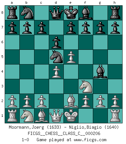 Last move : 1-0 2014 January 24 23:51:57 [Event "FICGS__CHESS__CLASS_C__000206"] [Site "FICGS"] [Date "2013.12.12"] [Round "1"] [White "Moormann,Joerg"] [Black "Niglio,Biagio"] [Result "1-0"] [WhiteElo "1633"] [BlackElo "1640"] 1.e4 Nf6 2.e5 Nd5 3.d4 d6 4.Nf3 Bg4 5.Be2 1-0 This chess game has been lost on time (started : 2013.12.12 18:29:9) Alekhine's defense : Modern variation, 4...Bg4 Player White won this chess game. Follow this game move after move (download)Not only will I predict his triumph over Botvinnik, but I'll go further and say that he'll probably be the greatest Chess player that ever lived. (John Collins) Jeder leidlich begabte Spieler, er braucht keineswegs hervorragend veranlagt zu sein, kann es zum Meister bringen. Aber das ist ja auch gar nicht nötig! Der richtige Standpunkt ist es, zu seinem Vergnügen zu spielen, und man glaube ja nicht, dass der Genuss proportional dem Können sei. (Siegbert Tarrasch) Antes de los Finales, los dioses han colocado el Juego Medio. (Siegbert Tarrasch) Vous m'avez demandé de vous exposer quel est le fondement de la prière. Je ne fais que préparer les pièces du jeu sur la table... Nous sera-t-il permis d'en adopter les règles et si nous les appliquons scrupuleusement nous ne tarderons pas à faire mat le Roi divin ! Il ne pourra échapper à nos mains. (Sainte Thérèse d'Avila, Chemin de perfection) If passion drives you, let reason holds the reins. (Benjamin Franklin)