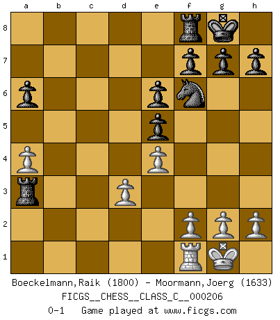 Last move : 0-1 2014 January 8 8:40:20 [Event "FICGS__CHESS__CLASS_C__000206"] [Site "FICGS"] [Date "2013.12.12"] [Round "1"] [White "Boeckelmann,Raik"] [Black "Moormann,Joerg"] [Result "0-1"] [WhiteElo "1800"] [BlackElo "1633"] 1.e4 c5 2.Nf3 d6 3.d4 cxd4 4.Nxd4 Nf6 5.Bb5+ Bd7 6.Nc3 Bxb5 7.Ndxb5 a6 8.Nd4 Nbd7 9.O-O e6 10.Qd3 Be7 11.Nf3 O-O 12.b4 Rc8 13.a4 Ne5 14.Nxe5 dxe5 15.b5 Qxd3 16.cxd3 Rxc3 17.Ra3 Bxa3 18.Bxa3 Rxa3 19.bxa6 bxa6 0-1 Sicilian Kingside Castling by player White (move 9) Kingside Castling by player Black (move 11) Player Black won this chess game. Follow this game move after move (download)Dazzling combinations are for the many, shifting wood is for the few. (Georg Kieninger) Fischer ist das größte Genie, das je vom Schachhimmel heruntergestiegen ist. (Mikhail Nekhemyevich Tal) El Ajedrez es una manera fabulosa para que los niños aprendan a autovalorarse y a autoestimarse. (Saudin Robovic) Aux échecs, les retours au sommet sont rares : les dommages psychologiques consécutifs à une défaite sont trop sévères. (Daily Telegraph) Memory is a crazy woman that hoards colored rags and throws away food. (Austin O'Malley)