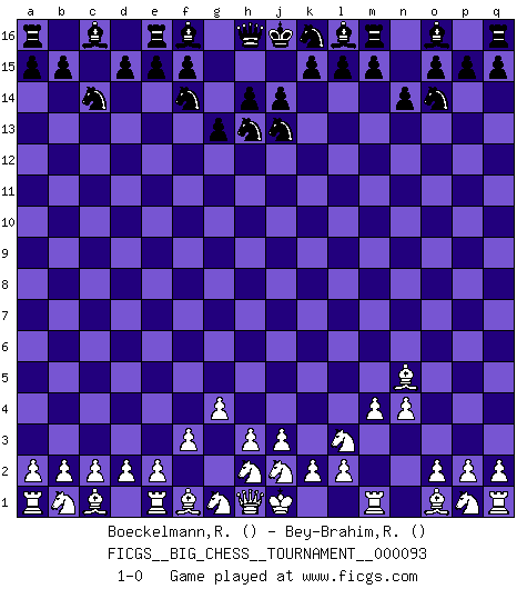 Last move : 1-0 2014 January 25 11:51:9 [Event "FICGS__BIG_CHESS__TOURNAMENT__000093"] [Site "FICGS"] [Date "2013.12.15"] [Round "1"] [White "Boeckelmann,Raik"] [Black "Bey-Brahim,Reza"] [Result "1-0"] [WhiteElo ""] [BlackElo ""] 1.n2-n4 n15-n14 2.m2-m4 p16-o14 3.l1-o4 g15-g13 4.o4-c15 b16-c14 5.c15-n5 g16-f14 6.k1-l3 j15-h13 7.g2-g4 h15-j13 8.f2-f3 1-0 This big chess game has been lost on time (started : 2013.12.15 22:33:27) Follow this game move after move (download)Everything is in a state of flux, and this includes the world of Chess. (Mikhail Botvinnik) Smyslow ist ein Beweis dafür, dass ich noch zehn Jahre spielen kann! [der 75 jährige über den 85 jährigen] (Viktor Kortschnoi) Fischer sacrificó virtualmente todo lo que la mayoría de nosotros los 'debiles' (término que él usa) valoramos, respetamos y apreciamos por el amor de un astuto, a menudo hermoso tablero de juego, por el privilegio ambivalente de ser su mas grande maestro. (Paul Kollar) Donnez-moi un Cavalier en 6e et je gagnerais toutes mes parties. (Steinitz) Hold em is to stud what chess is to checkers. (Johnny Moss)