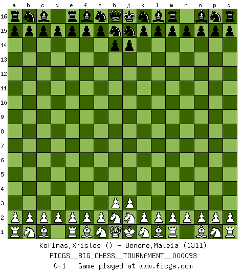 Last move : 0-1 2013 December 19 18:36:39 [Event "FICGS__BIG_CHESS__TOURNAMENT__000093"] [Site "FICGS"] [Date "2013.12.15"] [Round "1"] [White "Kofinas,Xristos"] [Black "Benone,Mateia"] [Result "0-1"] [WhiteElo ""] [BlackElo "1311"] 0-1 Follow this game move after move (download)When the Chess game is over, the Pawn and the King go back to the same box. (Irish saying) Ivan Sokolov treibt mich als Beifahrer an mit go Loeky go - . (Loek van Wely) Un entendimiento a fondo de las continuaciones típicas del mate, hace de las combinaciones de sacrificio mas complicadas conducirlas a ellas no solo sin dificultad, sino casi de una manera natural. (Siegbert Tarrasch) Ce n'est pas pour s'amuser qu'il joue aux échecs : il célèbre un culte. (Vladimir Nabokov) It is not enough to be a good player... you must also play well. (Siegbert Tarrasch)