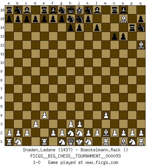 Last move : 1-0 2014 January 28 0:36:53 [Event "FICGS__BIG_CHESS__TOURNAMENT__000093"] [Site "FICGS"] [Date "2013.12.15"] [Round "1"] [White "Snaden,Ladane"] [Black "Boeckelmann,Raik"] [Result "1-0"] [WhiteElo "1437"] [BlackElo ""] 1.e2-e4 n15-n13 2.f1-c4 p16-q14 3.d2-d3 o15-o13 4.m2-m4 p15-p13 5.c1-p13 m16-n16 6.p13-o14 q16-p16 7.l1-m2 p16-p14 8.o14-q12 m15-m13 9.c4-m13 l15-l14 10.m13-o15 1-0 Follow this game move after move (download)What is the difference between chess and football? Everybody understands football, but nobody plays it. Everybody plays chess, but nobody understands it. Everything is relative. (Vladimir Kramnik) Man wirke der falschen Auffassung entgegen, als ob jeder Zug Unmittelbares zu leisten habe; auch Werte- und Ruhezüge haben ihre Existenzberechtigung. (Aaron Nimzowitsch) La vida es como un juego de Ajedrez, cambiando con cada movimiento. (Proverbio Chino) Aidez vos pièces, elles vous aideront. (Paul Morphy) Have no fear of perfection - you'll never reach it. (Salvador Dali)
