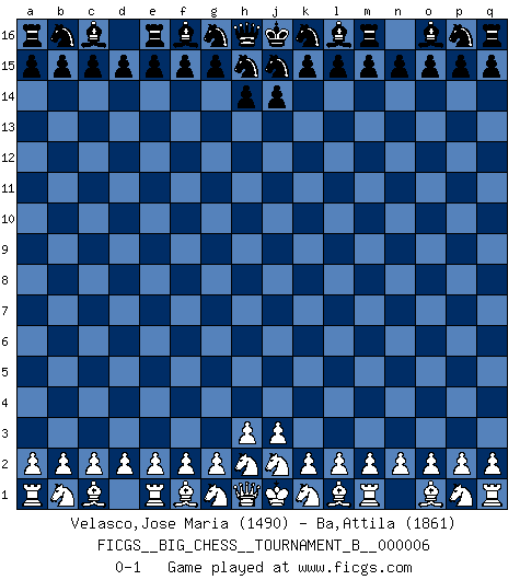 Last move : 0-1 2014 January 18 23:24:4 [Event "FICGS__BIG_CHESS__TOURNAMENT_B__000006"] [Site "FICGS"] [Date "2013.12.19"] [Round "1"] [White "Velasco,Jose Maria"] [Black "Ba,Attila"] [Result "0-1"] [WhiteElo "1490"] [BlackElo "1861"] 0-1 This big chess game has been lost on time (started : 2013.12.19 17:9:19) Follow this game move after move (download)The Pin is mightier than the sword. (Fred Reinfeld) Ich tröste mich mit dem Vergnügen, daß Schachfans, Zuschauer und Leser glücklich sind, wenn ein Großmeister etwas riskiert, statt nur Klötzchen zu schieben. (Mikhail Nekhemyevich Tal) La caracteristica mas importante en la posición del Ajedrez es la actividad de las piezas. Esto es absolutamente fundamental en todas las fases del juego: Apertura, Juego Medio y especialmente Finales. La limitación primordial en la actividad de una pieza, es la estructuración de los Peones. (Michael Stean) Il n'y a pas de prix trop élevé au scalp de l'ennemi. (Koblentz) Everybody lies. (Gregory House, House M.D.)