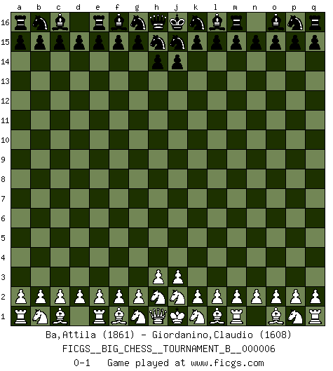Last move : 0-1 2014 January 18 23:24:4 [Event "FICGS__BIG_CHESS__TOURNAMENT_B__000006"] [Site "FICGS"] [Date "2013.12.19"] [Round "1"] [White "Ba,Attila"] [Black "Giordanino,Claudio"] [Result "0-1"] [WhiteElo "1861"] [BlackElo "1608"] 0-1 This big chess game has been lost on time (started : 2013.12.19 17:9:19) Follow this game move after move (download)The Pawns are the soul of the game. (Francois Andre Danican Philidor) Sicherlich können nur Meister einen Stil haben. Daß ein nicht-Meister auch nur ein einziges Mal in seinem Leben eine Partie folgerecht durchführte, habe ich niemals bemerkt. (Emanuel Lasker) Los problemas de Ajedrez exigen del compositor las mismas virtudes que caracterizan todo el arte de valor: originalidad, invención, concisión, armonía, complejidad e insinceridad explendida. (Vladimir Nabokov) Un footballeur joue avec ses pieds, parfois avec sa tête. Un joueur d'échecs ne joue qu'avec sa tête. Et quand il ne joue plus, il meurt. (Jacob Murray) A bird doesn't sing because it has an answer, it sings because it has a song. (Maya Angelou)