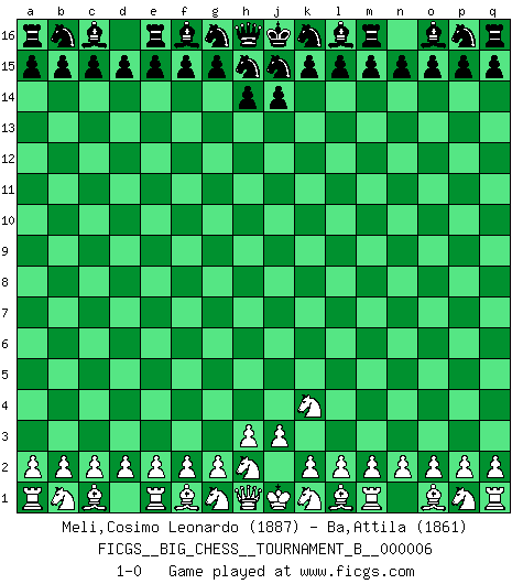 Last move : 1-0 2014 January 18 23:24:4 [Event "FICGS__BIG_CHESS__TOURNAMENT_B__000006"] [Site "FICGS"] [Date "2013.12.19"] [Round "1"] [White "Meli,Cosimo Leonardo"] [Black "Ba,Attila"] [Result "1-0"] [WhiteElo "1887"] [BlackElo "1861"] 1.j2-k4 1-0 This big chess game has been lost on time (started : 2013.12.19 17:9:19) Follow this game move after move (download)The older I grow, the more I value pawns. (Paul Keres) Bobby Fischer ist kein Vorbild für die heutige Jugend. (Viktor Kortschnoi) Robert Fischer es la ley hacia si mismo. (Larry Evans) Même si l'adversaire joue le coup analysé précédemment, recommencez l'analyse en voyant la nouvelle position. Première règle de Blumenfeld Programmer - an organism that turns coffee into software. (Anonymous)