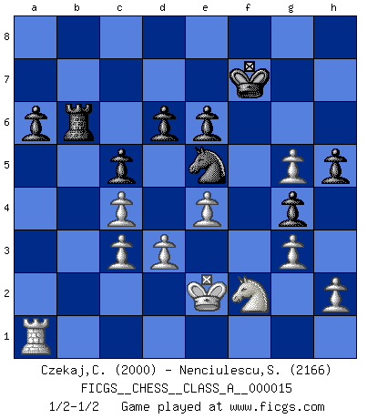 Last move : 1/2-1/2 2007 September 24 12:53:40 [Event "FICGS__CHESS__CLASS_A__000015"] [Site "FICGS"] [Date "2007.02.10"] [Round "1"] [White "Czekaj,Christophe"] [Black "Nenciulescu,Silviu"] [Result "1/2-1/2"] [WhiteElo "2000"] [BlackElo "2166"] 1.e4 c5 2.Nf3 d6 3.Bb5+ Bd7 4.Bxd7+ Nxd7 5.c4 Ngf6 6.Nc3 g6 7.O-O Bg7 8.d3 O-O 9.Ng5 h6 10.Nh3 a6 11.f4 Rb8 12.a4 e6 13.Nf2 Re8 14.Qf3 Nh5 15.Ng4 f5 16.Ne3 Qh4 17.g3 Qh3 18.Ncd1 Nhf6 19.Bd2 Ng4 20.Nxg4 Qxg4 21.Qxg4 fxg4 22.Bc3 g5 23.fxg5 h5 24.Kg2 Rf8 25.a5 Rxf1 26.Kxf1 Bxc3 27.bxc3 b5 28.axb6 Rxb6 29.Ke2 Kf7 30.Nf2 Ne5 1/2-1/2 Sicilian : Canal-Sokolsky attack, 3...Bd7 Kingside Castling by player White (move 7) Kingside Castling by player Black (move 8) This chess game ended in a draw. Follow this game move after move (download)A bad plan is better than none at all. (Frank Marshall) Oft bringt ein stiller Zug das Erdbeben. (Richard Reti) La belleza de un movimiento no se refleja solo en su apariencia, sino en el pensamiento detrás de él. (Siegbert Tarrasch) Les Echecs sont et restent toujours un combat, un combat intégral comme la boxe, la lutte ou un autre sport, et où il doit y avoir un vainqueur et un vaincu. (Joseph Emil Diemer) 'preceded by its own quotation yields a falsehood' preceded by its own quotation yields a falsehood. (W. V. O. Quine - Set Theory And Its Logic, 1953)