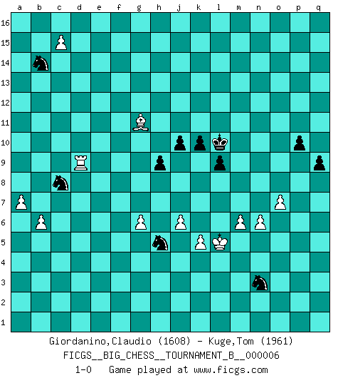Last move : 1-0 2014 May 29 0:0:1 [Event "FICGS__BIG_CHESS__TOURNAMENT_B__000006"] [Site "FICGS"] [Date "2013.12.19"] [Round "1"] [White "Giordanino,Claudio"] [Black "Kuge,Tom"] [Result "1-0"] [WhiteElo "1608"] [BlackElo "1961"] 1.j2-k4 m15-m13 2.h1-o7 h15-g13 3.e2-e4 p16-o14 4.h2-g4 b16-c14 5.m2-m4 d15-d13 6.d2-d4 l16-p12 7.p1-o3 n15-n14 8.l1-p5 k16-h15 9.f1-b5 c16-l8 10.k1-h2 j15-h13 11.b1-c3 e15-e14 12.g1-j2 f16-d14 13.n2-n3 h16-m12 14.g4-e5 g16-j15 15.h2-g4 d14-h10 16.o1-f9 o16-k12 17.c1-l9 h10-j9 18.c3-d5 k15-k13 19.c2-c3 a15-a13 20.a2-a4 a13-a12 21.m1-m3 j16-k15 22.m3-l3 l8-m9 23.o7-o12 m12-o12 24.l9-o12 n14-n13 25.o12-h6 q16-n16 26.j1-h2 a12-a11 27.j2-h4 a11-a10 28.f9-j6 m9-j6 29.k4-j6 a10-a9 30.h6-g7 j9-h10 31.e1-e3 l15-l14 32.e3-f3 a9-a8 33.f3-f7 a8-a7 34.d5-b4 a16-a12 35.e5-c6 e16-a16 36.g7-d10 a7-a6 37.b4-a6 a12-a6 38.b5-a6 a16-a6 39.d4-d5 m16-a16 40.b2-b3 f15-f13 41.c6-d4 p12-j6 42.h4-j6 a6-j6 43.f7-b7 b15-b14 44.a1-d1 a16-a10 45.d10-k4 j15-g14 46.d1-d3 g14-e15 47.d3-f3 h13-f14 48.f3-f7 f14-e12 49.l3-l8 l14-l13 50.q1-m1 n13-n12 51.m1-m3 m13-m12 52.m3-l3 l13-l12 53.l3-l6 j6-j10 54.b7-a7 n16-a16 55.a7-a10 a16-a10 56.k4-m6 h10-m6 57.l6-m6 m12-m11 58.m6-m7 h15-k14 59.f7-a7 k14-m13 60.a7-a10 j10-a10 61.l8-l7 q15-q13 62.l7-a7 a10-a7 63.m7-a7 c14-a13 64.p5-o4 c15-c13 65.o4-c15 e15-c16 66.d4-e6 h14-h13 67.c3-c4 o14-p12 68.o3-n5 d13-d12 69.c4-c5 e12-f14 70.b3-b4 f14-d13 71.c15-j9 l12-l11 72.b4-b5 c16-e15 73.c5-c6 g13-h11 74.j9-h8 g15-g13 75.a4-a5 e14-e13 76.a5-a6 e15-c14 77.f2-f4 e13-e12 78.l2-l4 f13-f12 79.p2-p4 o15-o13 80.q2-q4 p15-p13 81.o2-o3 k12-j11 82.q4-q5 k15-l14 83.n3-n4 n12-n11 84.k2-k4 p12-o10 85.m4-m5 p13-p12 86.g4-j5 q13-q12 87.g2-g4 q12-q11 88.f4-f5 o13-o12 89.e6-d8 f12-f11 90.d8-f9 e12-e11 91.n5-l6 h13-h12 92.h3-h4 k13-k12 93.k4-k5 g13-g12 94.h4-h5 g12-g11 95.j3-j4 g11-g10 96.f9-d8 l14-k13 97.h2-h3 q11-q10 98.d8-c10 j14-j13 99.o3-o4 g10-g9 100.h8-m4 h11-g13 101.o4-o5 h12-h11 102.j5-h7 h11-h10 103.h7-k8 j13-j12 104.m4-n5 j11-p5 105.k8-h9 j12-j11 106.h9-g11 m13-k14 107.g11-f13 k14-j12 108.f13-d14 j12-g11 109.c10-a11 g11-e12 110.a11-c12 e12-d14 111.c12-d14 k13-j12 112.n5-l3 l11-l10 113.n4-n5 p12-p11 114.n5-n6 p5-l9 115.o5-o6 k12-k11 116.p4-p5 f11-f10 117.p5-p6 e11-e10 118.o6-o7 h10-h9 119.d14-f13 g13-e12 120.q5-q6 j11-j10 121.q6-q7 l9-m10 122.p6-p7 j12-h13 123.l3-n5 m10-j13 124.f13-d14 e12-d14 125.n5-d14 j13-p7 126.d14-j9 h13-j12 127.j9-n13 o10-q11 128.a7-e7 d12-d11 129.e4-e5 f10-f9 130.e5-e6 q10-q9 131.j4-j5 p11-p10 132.j5-j6 o12-o11 133.b5-b6 q11-p9 134.n13-m12 p7-m10 135.q7-q8 p9-n10 136.m12-j15 n10-o8 137.l6-n7 n11-n10 138.n7-l8 m10-l11 139.j15-n11 o8-p6 140.h3-j4 k11-k10 141.l8-m10 l11-m10 142.n11-m10 p6-q8 143.e7-m7 c14-d12 144.m10-n9 d12-c10 145.m7-m11 c13-c12 146.m11-o11 c10-b8 147.a6-a7 b8-d9 148.d5-d6 a13-b11 149.o11-o12 j12-k11 150.o12-c12 l10-l9 151.c12-n12 b11-c9 152.n12-n10 c9-e8 153.n10-n11 k11-l10 154.n11-d11 d13-c11 155.d6-d7 e8-f6 156.g4-g5 f6-e4 157.g5-g6 b14-b13 158.c6-c7 b13-b12 159.n9-h4 e4-d6 160.c7-c8 d9-f8 161.e6-e7 f8-g10 162.f5-f6 g10-e9 163.d11-d12 q8-p6 164.h4-j5 e9-g8 165.d12-b12 c11-a10 166.b12-b10 a10-c9 167.d7-d8 c9-d11 168.b10-d10 d11-f12 169.c8-c9 g8-f6 170.j5-f2 p6-n5 171.d8-d9 d6-e8 172.d10-d12 f12-g10 173.c9-c10 e10-d9 174.c10-c11 g10-e11 175.c11-c12 n5-l4 176.c12-c13 e11-f13 177.d12-d9 f13-e15 178.d9-f9 e15-d13 179.c13-c14 f6-g4 180.f9-d9 d13-c15 181.f2-o10 g4-h6 182.j4-k4 l4-n3 183.m5-m6 e8-g7 184.d9-g9 h6-g8 185.o10-k14 g7-h5 186.k4-l5 g8-e7 187.k14-g11 c15-d13 188.g9-e9 e7-c8 189.e9-d9 d13-b14 190.c14-c15 1-0 Follow this game move after move (download)Bobby is the finest Chess player this country ever produced. His memory for the moves, his brilliance in dreaming up combinations, and his fierce determination to win are uncanny. (John Collins) Schach sollte überall auf der Welt Schulfach werden. Es fördert die geistige Auseinandersetzung. Es lehrt die Demut in der Niederlage. (Garry Kasparov) El jugador táctico debe saber que hacer cuando algo se debe de hacer. El estratégico debe saber que hacer cuando nada se debe de hacer. (Savielly Tartakover) Soyez une menace à chaque fois que vous vous asseyez pour jouer. (Ken Smith) Life is like a ten-speed bicycle: most of us have gears we never use. (Charles M. Schulz)