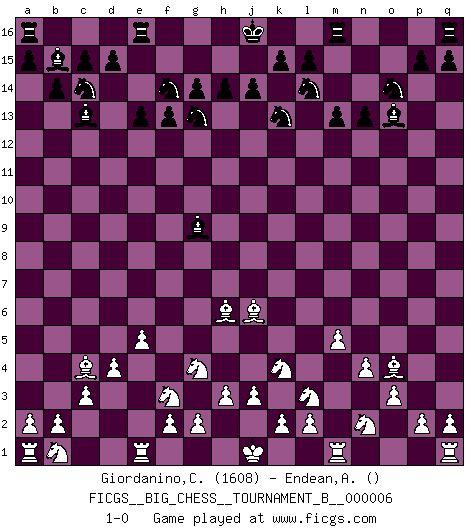 Last move : 1-0 2014 January 30 20:37:53 [Event "FICGS__BIG_CHESS__TOURNAMENT_B__000006"] [Site "FICGS"] [Date "2013.12.19"] [Round "1"] [White "Giordanino,Claudio"] [Black "Endean,Andrew"] [Result "1-0"] [WhiteElo "1608"] [BlackElo ""] 1.j2-k4 j15-k13 2.h1-o7 g15-g14 3.o7-o15 p16-o14 4.o15-g8 h16-f14 5.g1-f3 b15-b14 6.n2-n4 c16-b15 7.k1-l3 e15-e13 8.e2-e4 f16-c13 9.o2-o3 f14-g13 10.g8-g13 h15-g13 11.o1-j6 m15-m13 12.d2-d4 b16-c14 13.h2-g4 l16-q11 14.c1-h6 n15-n13 15.m2-m4 k16-l14 16.l1-o4 f15-f13 17.f1-c4 g16-f14 18.m4-m5 o16-d6 19.e4-e5 d6-g9 20.p1-n2 q11-o13 21.c2-c3 1-0 Follow this game move after move (download)A thorough understanding of the typical mating continuations makes the most complicated sacrificial combinations leading up to them not only not difficult, but almost a matter of course. (Siegbert Tarrasch) Gewinnen beim Schach fördert das Selbstvertrauen. Beim Sex spüre ich sowas nicht... (Garry Kasparov) El Ajedrez, como cualquier otra actividad creativa, puede existir solo a través de méritos combinados de aquellos que tienen talento creativo y de aquellos que tienen la habilidad de organizar un trabajo creativo. (Mikhail Botvinnik) Le thème de l'attaque double intervient d'une manière ou d'une autre dans l'immense majorité des combinaisons. (Youri Averbakh) Those parts of the system that you can hit with a hammer (not advised) are called hardware; those program instructions that you can only curse at are called software. (Anonymous)