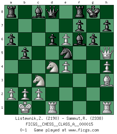 Last move : 0-1 2007 May 25 23:6:40 [Event "FICGS__CHESS__CLASS_A__000015"] [Site "FICGS"] [Date "2007.02.10"] [Round "1"] [White "Listewnik,Zbigniew"] [Black "Sammut,Ronald"] [Result "0-1"] [WhiteElo "2190"] [BlackElo "2338"] 1.e4 c5 2.Nf3 d6 3.d4 cxd4 4.Nxd4 Nf6 5.Nc3 a6 6.Bg5 e6 7.f4 Be7 8.Qf3 Qc7 9.O-O-O Nbd7 10.g4 b5 11.Bxf6 Nxf6 12.g5 Nd7 13.f5 Bxg5+ 14.Kb1 Ne5 15.Qh5 Qd8 16.h4 Bf6 17.fxe6 O-O 18.Bh3 g6 0-1 Sicilian : Najdorf, 7...Be7 Queenside Castling by player White (move 9) Kingside Castling by player Black (move 17) Player Black won this chess game. Follow this game move after move (download)Place the contents of the Chess box in a hat, shake them up vigorously, pour them on the board from a height of two feet, and you get the style of Steinitz. (H. E. Bird) Kein Schachspieler kann gut schlafen. (H. G. Wells) En la vida, como en el Ajedrez, los Peones propios obstruyen nuestro camino. La gran fortuna de un hombre, su comodidad, placer, hijos, libros, que deberían ayudarle a ganar, con mucha frecuencia lo ponen en Jaque Mate. (Charles Buxton) Les échecs, c'est la lutte contre l'erreur. (Johannes Zukertort) Shallow men believe in luck. Strong men belive in cause and effect. (Ralph Waldo Emerson)