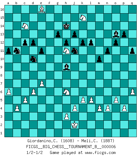 Last move : 1/2-1/2 2014 August 6 22:13:17 [Event "FICGS__BIG_CHESS__TOURNAMENT_B__000006"] [Site "FICGS"] [Date "2013.12.19"] [Round "1"] [White "Giordanino,Claudio"] [Black "Meli,Cosimo Leonardo"] [Result "1/2-1/2"] [WhiteElo "1608"] [BlackElo "1887"] 1.j2-k4 h15-g13 2.h2-g4 j15-k13 3.m2-m4 m15-m13 4.e2-e4 e15-e13 5.d2-d4 n15-n13 6.n2-n4 d15-d13 7.f1-b5 f16-b12 8.l1-p5 o16-f8 9.m1-m3 l16-p12 10.q2-q4 p16-o14 11.e1-e3 b16-c14 12.k1-h2 g16-j15 13.g1-j2 k16-h15 14.b1-c3 c16-l8 15.m3-l3 e16-e14 16.o1-f9 h15-k14 17.e3-f3 j15-h13 18.c1-l9 j16-j15 19.j2-h4 h16-h15 20.h1-m5 h15-e12 21.m5-e12 g13-e12 22.h2-j4 m16-m14 23.j1-h2 m14-l14 24.p1-o3 k14-l12 25.a2-a4 a15-a13 26.h4-f5 e14-g14 27.c3-d5 q15-q13 28.c2-c3 a16-e16 29.j4-h6 e16-e14 30.f5-e7 m13-m12 31.k4-m5 h13-j11 32.k2-k4 f15-f13 33.j3-j4 c14-d12 34.f3-f5 c15-c13 35.k4-k5 c13-c12 36.e4-e5 b15-b13 37.b2-b4 o14-m13 38.f2-f4 l12-n11 39.g2-g3 o15-o13 40.o3-n5 p15-p14 41.o2-o4 n13-n12 42.p2-p3 j11-l10 43.l3-l6 m13-l11 44.h6-g8 l14-l12 45.l2-l4 l15-l13 46.d5-c7 h14-h13 47.e5-e6 k15-k14 48.d4-d5 f13-f12 49.c3-c4 g14-g11 50.c4-c5 g15-g13 51.q1-p1 m12-m11 52.g4-f6 k13-j11 53.o4-o5 h13-h12 54.l4-l5 j14-j13 55.q4-q5 q13-q12 56.p3-p4 a13-a12 57.a4-a5 j15-h14 58.q5-q6 q12-q11 59.a5-a6 q16-p16 60.f6-h7 f8-c11 61.c7-d9 c11-d10 62.e7-c8 d10-c9 63.h7-j9 l10-j9 64.g8-j9 l8-k9 65.f5-j5 b12-j5 66.l9-n11 j5-g3 67.h2-j2 l11-m9 68.n11-m10 d12-b11 69.f9-g8 n12-n11 70.g8-l12 j11-l12 71.m10-h6 l12-j11 72.d9-f8 f12-f11 73.j9-h7 o13-o12 74.f4-f5 c9-h4 75.f5-f6 e12-d10 76.c8-e9 p14-p13 77.f6-f7 m11-m10 78.a1-g1 e13-e12 79.p5-l1 h4-l1 80.p1-l1 g3-h4 81.g1-g11 h4-l1 82.g11-g8 l1-d8 83.e9-c10 d8-g11 84.c10-b12 d13-d12 85.b5-j12 e12-e11 86.l6-p6 k9-o13 87.b12-d13 f11-f10 88.f8-e10 g11-e13 89.h7-k8 m9-l11 90.j12-c6 l11-m9 91.n5-m7 m9-k8 92.h6-k8 e13-k8 93.g8-k8 k14-k13 94.m5-l7 k13-k12 95.k8-b8 p16-m16 96.m7-o8 m16-m11 97.o8-m9 m11-k11 98.c6-j12 k11-k7 99.b8-g8 e14-e12 100.l7-j8 e12-g12 101.m9-k10 g12-g8 102.f7-g8 k7-h7 103.p6-h6 h7-h6 104.j8-h6 o13-e4 105.d5-d6 e4-d5 106.e6-e7 p12-n14 107.g8-g9 f10-g9 108.e10-g9 b11-c9 109.j12-e16 b13-b12 110.d13-b12 a12-a11 111.b12-c14 c9-b11 112.k10-m11 l13-l12 113.m11-l13 n14-o13 114.g9-h11 d5-h9 115.l13-k15 1/2-1/2 Follow this game move after move (download)Fischer is completely natural. He plays no roles. He's like a child. Very, very simple. (Zita Rajcsanyi) Als ich elf wurde, wurde ich einfach gut. (Robert James Fischer) Fischer no está bajo la obligación de nadie. (Joseph Platz) Karpov est une pièce de musée. (Garry Kasparov) Shallow men believe in luck. Strong men belive in cause and effect. (Ralph Waldo Emerson)