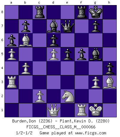 Last move : 1/2-1/2 2014 June 13 11:13:26 [Event "FICGS__CHESS__CLASS_M__000066"] [Site "FICGS"] [Date "2013.12.21"] [Round "1"] [White "Burden,Don"] [Black "Plant,Kevin D."] [Result "1/2-1/2"] [WhiteElo "2236"] [BlackElo "2280"] 1.e4 c5 2.Nf3 d6 3.d4 cxd4 4.Nxd4 Nf6 5.Nc3 a6 6.h3 e5 7.Nde2 h5 8.g3 Be6 9.Bg2 Nbd7 10.O-O Be7 11.a4 Rc8 12.Be3 Nc5 13.b3 O-O 14.a5 Bd7 15.b4 Ne6 16.Nd5 Nxd5 17.exd5 Ng5 18.f4 Nxh3+ 19.Kh2 Ng5 20.fxg5 Bxg5 21.Bb6 Qe7 22.Ra3 h4 23.Bh3 f5 24.Kg1 1/2-1/2 Sicilian : Najdorf, Adams attack Kingside Castling by player White (move 10) Kingside Castling by player Black (move 13) This chess game ended in a draw. Follow this game move after move (download)Chess is not like life... it has rules ! (Mark Pasternak) Mutter, ich bin eben Ex-Weltmeister geworden. --beim nach Hause Kommen nach dem Verlust des WM-Titels an Mihail Botvinnik -- (Mikhail Nekhemyevich Tal) El Ajedrez es parte de la cultura, y si una cultura esta en decadencia, entonces también el Ajedrez declinará. (Mikhail Botvinnik) Psychologiquement, tu dois avoir confiance en toi même, mais cette confiance doit être basée sur des faits. (Robert Fischer) Being number two sucks. (Andre Agassi)