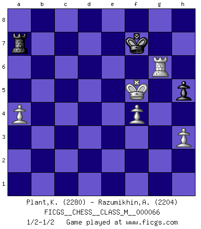 Last move : 1/2-1/2 2014 December 15 23:47:2 [Event "FICGS__CHESS__CLASS_M__000066"] [Site "FICGS"] [Date "2013.12.21"] [Round "1"] [White "Plant,Kevin D."] [Black "Razumikhin,Andrey"] [Result "1/2-1/2"] [WhiteElo "2280"] [BlackElo "2204"] 1.e4 c5 2.Nf3 Nc6 3.Bb5 d6 4.O-O Bd7 5.Re1 Nf6 6.c3 a6 7.Bf1 Bg4 8.d4 cxd4 9.cxd4 e5 10.d5 Nd4 11.Be3 Nxf3+ 12.gxf3 Bd7 13.Nd2 b5 14.a4 Be7 15.axb5 axb5 16.Qb3 O-O 17.Rec1 h6 18.Rxa8 Qxa8 19.Rc7 Qa1 20.Qa3 Qxa3 21.bxa3 Rb8 22.Ba7 Ra8 23.Rb7 Bd8 24.Bb8 Be7 25.Nb1 Kf8 26.Bxb5 Bxb5 27.Rxb5 Nd7 28.Bc7 Ke8 29.Ba5 Nc5 30.Kf1 Nd3 31.Ke2 Nf4+ 32.Kd1 Nh3 33.Bb4 f5 34.exf5 Nxf2+ 35.Kd2 Bg5+ 36.Ke2 Nh3 37.Bxd6 Nf4+ 38.Kd1 Rd8 39.Bxe5 Nxd5 40.Ke2 Nf4+ 41.Ke3 Nd3 42.f4 Nxe5 43.Rxe5+ Be7 44.a4 Kd7 45.Nc3 Ra8 46.Nd5 Bd8 47.Re4 Ra5 48.Rd4 Ke8 49.Ke4 Ra7 50.h3 Kf7 51.Rc4 Ba5 52.f6 gxf6 53.Kf5 Ra6 54.Rc8 h5 55.Rb8 Ra7 56.Rh8 Kg7 57.Re8 Kf7 58.Re6 Bd8 59.Rd6 Be7 60.Nxe7 Kxe7 61.Re6+ Kf7 62.Rxf6+ Kg7 63.Rg6+ Kf7 1/2-1/2 Sicilian : Nimzovich-Rossolimo attack (without ...d6) Kingside Castling by player White (move 4) Kingside Castling by player Black (move 16) 10 pieces endgame at move 60 : White KRNPPP , Black KRPP WHITE : King + 1 Rook 1 Knight 3 Pawns BLACK : King + 1 Rook 2 Pawns 9 pieces endgame at move 60 : White KRPPP , Black KRPP WHITE : King + 1 Rook 3 Pawns BLACK : King + 1 Rook 2 Pawns 8 pieces endgame at move 62 : White KRPPP , Black KRP WHITE : King + 1 Rook 3 Pawns BLACK : King + 1 Rook 1 Pawn This chess game ended in a draw. Follow this game move after move (download)Could we look into the head of a Chess player, we should see there a whole world of feelings, images, ideas, emotion and passion. (Alfred Binet) Matt entspricht nicht immer den Tatsachen. (Savielly Grigorievitsch Tartakower) El tablero es el mundo, las piezas es el fenomeno del universo, las reglas del juego son lo que llamamos leyes de la naturaleza y el jugador del lado opuesto, se encuentra oculto a nuestra vista. (Thomas Huxley) Si rien de grave n'est détecté lors de l'analyse d'une position, on joue alors le coup. Seconde règle de Blumenfeld. Beta. Software undergoes beta testing shortly before it's released. Beta is latin for still doesn't work. (Anonymous)