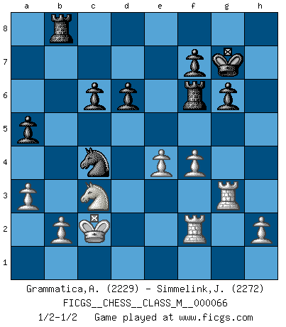 Last move : 1/2-1/2 2014 January 7 12:56:20 [Event "FICGS__CHESS__CLASS_M__000066"] [Site "FICGS"] [Date "2013.12.21"] [Round "1"] [White "Grammatica,Andrea"] [Black "Simmelink,Joop"] [Result "1/2-1/2"] [WhiteElo "2229"] [BlackElo "2272"] 1.d4 Nf6 2.c4 g6 3.f3 e5 4.dxe5 Nh5 5.Nh3 Nc6 6.Bg5 Be7 7.Bxe7 Qxe7 8.g4 Nxe5 9.gxh5 d6 10.Qb3 Bxh3 11.Bxh3 Qh4+ 12.Kd1 Qxh3 13.Qxb7 O-O 14.hxg6 hxg6 15.Qe4 Qg2 16.Re1 Rae8 17.Nc3 Qf2 18.Rc1 Re6 19.Kc2 Rfe8 20.Rf1 Qc5 21.Qd5 Qxc4 22.e4 c6 23.Qxc4 Nxc4 24.Rf2 Rf6 25.Rg1 Rf4 26.Rg3 Ne5 27.Rh3 Kg7 28.Ne2 Rf6 29.Nc3 a5 30.f4 Nd7 31.Rd3 Rb8 32.a3 Ne5 33.Rg3 Nc4 1/2-1/2 King's Indian defense Kingside Castling by player Black (move 13) This chess game ended in a draw. Follow this game move after move (download)Spassky will not be psyched out by Fischer. (Mike Goodall) Ich spiele ehrlich und spiele, um zu gewinnen. Wenn ich verliere nehme ich meine Medizin. (Robert James Fischer) Bobby es la celebridad menos entendida y malinterpretada que camina el la faz de esta tierra. (Yasser Seirawan) A chaque perte on perd un peu de soi. (Joël Lautier) Man is still the most extraordinary computer of all. (John F. Kennedy)