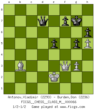Last move : 1/2-1/2 2014 August 13 12:2:44 [Event "FICGS__CHESS__CLASS_M__000066"] [Site "FICGS"] [Date "2013.12.21"] [Round "1"] [White "Antonov,Vladimir"] [Black "Burden,Don"] [Result "1/2-1/2"] [WhiteElo "2293"] [BlackElo "2236"] 1.e4 g6 2.d4 Bg7 3.Nc3 d6 4.Nf3 a6 5.Bc4 e6 6.O-O b5 7.Bd3 Bb7 8.b4 Nc6 9.Rb1 Qd7 10.Ne2 Nf6 11.a4 bxa4 12.c3 O-O 13.Ng3 Na7 14.Qc2 Rfd8 15.Rd1 e5 16.d5 c6 17.c4 cxd5 18.exd5 Rac8 19.Qa2 Nb5 20.Bb2 Nc7 21.Bc2 Nce8 22.Bxa4 Qc7 23.Nd2 Bh6 24.Ngf1 Rb8 25.h3 Bc8 26.Bc3 Bb7 27.Qc2 Nh5 28.Ne3 Nef6 29.Re1 Rdc8 30.Rbc1 Qd8 31.Qd3 Nf4 32.Qf1 Rc7 33.g3 N4xd5 34.cxd5 Bxe3 35.fxe3 Nxd5 36.Bb2 Nxb4 37.Rxc7 Qxc7 38.Rc1 Qe7 39.Bb3 a5 40.Ba3 Kg7 41.Kh2 d5 42.h4 h6 43.Qb5 Qd8 44.Bxb4 axb4 45.Qxb4 Ba6 46.Qc3 Qf6 47.Kg2 Rc8 48.Qa1 Rxc1 49.Qxc1 Qd6 50.Qc3 Bb7 51.Kf2 Qf6+ 52.Kg1 g5 53.h5 Qd6 54.Nf3 d4 55.exd4 Bxf3 56.Qxf3 Qxd4+ 57.Kf1 Qd7 58.Ke2 1/2-1/2 Robatsch defense : Two knights variation Kingside Castling by player White (move 6) Kingside Castling by player Black (move 12) This chess game ended in a draw. Follow this game move after move (download)Chess is no whit inferior to the violin, and we have a large number of professional violinists. (Mikhail Botvinnik) Schach verlangt totale Konzentration. (Robert James Fischer) Siempre es mejor sacrificar los hombres de tu oponente. (Savielly Tartakower) Le thème de l'attaque double intervient d'une manière ou d'une autre dans l'immense majorité des combinaisons. (Youri Averbakh) The hypothalamus is one of the most important parts of the brain, involved in many kinds of motivation, among other functions. The hypothalamus controls the 'Four Fs: Fighting, Fleeing, Feeding and Mating. (Unknown author)
