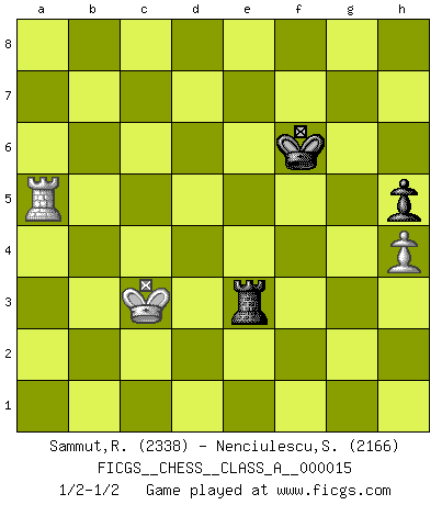 Last move : 1/2-1/2 2007 December 14 17:11:25 [Event "FICGS__CHESS__CLASS_A__000015"] [Site "FICGS"] [Date "2007.02.10"] [Round "1"] [White "Sammut,Ronald"] [Black "Nenciulescu,Silviu"] [Result "1/2-1/2"] [WhiteElo "2338"] [BlackElo "2166"] 1.e4 c5 2.c3 Nf6 3.e5 Nd5 4.d4 cxd4 5.Nf3 d6 6.cxd4 Nc6 7.Bc4 e6 8.O-O Be7 9.Qe2 O-O 10.Nc3 Nxc3 11.bxc3 Qa5 12.Bd2 Rd8 13.Bd3 dxe5 14.dxe5 b6 15.Bg5 Bb7 16.Qe4 Bxg5 17.Nxg5 g6 18.Qh4 h5 19.Nxf7 Rxd3 20.Qf6 Rd7 21.Qxg6+ Kf8 22.Ng5 Nxe5 23.Qh6+ Ke8 24.Nxe6 Ke7 25.Rfe1 Nf3+ 26.gxf3 Rg8+ 27.Ng5 Kd8 28.h4 Qf5 29.Qe6 Qxe6 30.Rxe6 Bxf3 31.a4 Rd3 32.Re3 Rxe3 33.fxe3 Bc6 34.a5 Kc7 35.Kf2 bxa5 36.Ne6+ Kd6 37.Nd4 a4 38.Nxc6 Kxc6 39.Rxa4 Kb6 40.Ke2 a5 41.Kd3 Rd8+ 42.Rd4 Ra8 43.Kc2 a4 44.Kb2 a3+ 45.Ka2 Rc8 46.Kb3 Ra8 47.Rb4+ Kc5 48.Ka2 Kd5 49.Rd4+ Ke5 50.Rc4 Kd5 51.Rf4 Ke5 52.c4 Ra5 53.Rd4 Ra4 54.c5 Ra5 55.c6 Rc5 56.Kxa3 Rxc6 57.Kb3 Rc1 58.Ra4 Re1 59.Ra5+ Kf6 60.Kc3 Rxe3+ 1/2-1/2 Sicilian : Alapin's variation (2.c3) Kingside Castling by player White (move 8) Kingside Castling by player Black (move 9) 10 pieces endgame at move 38 : White KRPPP , Black KRPPP WHITE : King + 1 Rook 3 Pawns BLACK : King + 1 Rook 3 Pawns 9 pieces endgame at move 39 : White KRPPP , Black KRPP WHITE : King + 1 Rook 3 Pawns BLACK : King + 1 Rook 2 Pawns 8 pieces endgame at move 56 : White KRPPP , Black KRP WHITE : King + 1 Rook 3 Pawns BLACK : King + 1 Rook 1 Pawn 7 pieces endgame at move 56 : White KRPP , Black KRP WHITE : King + 1 Rook 2 Pawns BLACK : King + 1 Rook 1 Pawn 6 pieces endgame at move 60 : White KRP , Black KRP WHITE : King + 1 Rook 1 Pawn BLACK : King + 1 Rook 1 Pawn This chess game ended in a draw. Follow this game move after move (download)Via the squares on the chessboard, the Indians explain the movement of time and the age, the higher influences which control the world and the ties which link Chess with the human soul. (Al-Masudi) Die Partien sind immer verschieden, die Interviews immer die gleichen. (Garry Kasparov) El Ajedrez no es una pizca de inferior al violín, y tenemos un gran número de violinistas profesionales. (Mikhail Botvinnik) Ce qui caractérise les parties de combat, c'est que si le défenseur a constamment de difficiles problèmes à résoudre, l'attaquant doit chercher sans relâche de nouvelles possibilités d'attaque. (Koblentz) I've lost money so fast in these clubs it's left me reeling. I've read every poker book ever written, but the only way to get better at the game is to go out and play with people who are really good. The problem is, you stand to lose a lot of money doing it. (Matt Damon)