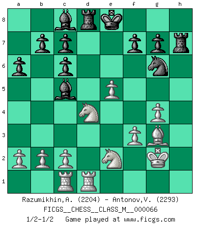 Last move : 1/2-1/2 2014 March 10 9:10:9 [Event "FICGS__CHESS__CLASS_M__000066"] [Site "FICGS"] [Date "2013.12.21"] [Round "1"] [White "Razumikhin,Andrey"] [Black "Antonov,Vladimir"] [Result "1/2-1/2"] [WhiteElo "2204"] [BlackElo "2293"] 1.e4 e5 2.Nf3 Nc6 3.Bb5 Nf6 4.O-O Nxe4 5.d4 Nd6 6.Bxc6 dxc6 7.dxe5 Nf5 8.Qxd8+ Kxd8 9.Nc3 h6 10.Rd1+ Ke8 11.h3 Be6 12.g4 Ne7 13.Nd4 Rd8 14.Kg2 Bc8 15.Bf4 Ng6 16.Bg3 h5 17.f3 Bc5 18.Nce2 hxg4 19.hxg4 a6 20.Rac1 Rh7 1/2-1/2 Ruy Lopez : Berlin defense, Open variation Kingside Castling by player White (move 4) This chess game ended in a draw. Follow this game move after move (download)Not only will I predict his triumph over Botvinnik, but I'll go further and say that he'll probably be the greatest Chess player that ever lived. (John Collins) Das typische an einem Großmeister ist, daß er eine gewonnene Position schnell und schmerzlos gewinnt. (Irving Chernev) Alekhine es un poeta que crea un trabajo de arte de algo que raramente inspiraría a otra persona a mandar una tarjeta postal. (Max Euwe) La solitude du joueur d'Echecs à l'approche du mat est semblable à celle du condamné. (Francis Szpiner) Experiences are the keys to life. (Daniel Parmet)