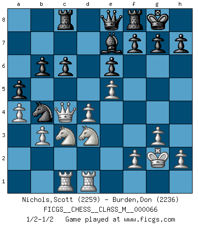 Last move : 1/2-1/2 2014 February 21 12:41:15 [Event "FICGS__CHESS__CLASS_M__000066"] [Site "FICGS"] [Date "2013.12.21"] [Round "1"] [White "Nichols,Scott"] [Black "Burden,Don"] [Result "1/2-1/2"] [WhiteElo "2259"] [BlackElo "2236"] 1.d4 Nf6 2.Nf3 e6 3.c4 d5 4.g3 Be7 5.Bg2 O-O 6.O-O dxc4 7.Qc2 a6 8.a4 Bd7 9.Qxc4 Bc6 10.Bg5 a5 11.Nc3 Na6 12.Bxf6 Bxf6 13.e4 Nb4 14.Rfd1 Rc8 15.Ne1 Be7 16.Rac1 Qe8 17.b3 b6 18.e5 Bxg2 19.Kxg2 c6 20.Nd3 1/2-1/2 Queen's pawn game Kingside Castling by player Black (move 5) Kingside Castling by player White (move 6) This chess game ended in a draw. Follow this game move after move (download)The Chess pieces are the block alphabet which shapes thoughts; and these thoughts, although making a visual design on the chessboard, express their beauty abstractly, like a poem. (Marcel Duchamp) Ich bin es gewohnt, das die Jugend mir überhaupt keinen Respekt entgegenbringt. (Alexander Morozewich) Una victoria por una combinación errónea, aunque sea espectacular, me llena de horror artístico. (Wilhelm Steinitz) La tactique, c'est ce que vous faites quand il y a quelque chose à faire; la stratégie, c'est ce que vous faites quand il n'y a rien à faire. (Savielli Tartacower) Chess is as much a mystery as women. (Purdy)