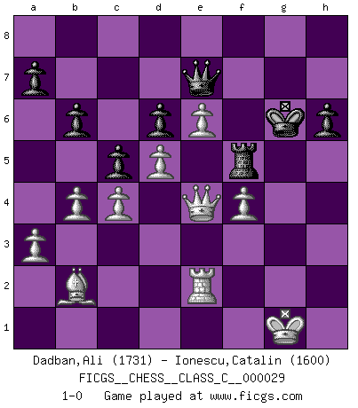 Last move : 1-0 2007 June 29 16:54:59 [Event "FICGS__CHESS__CLASS_C__000029"] [Site "FICGS"] [Date "2007.02.11"] [Round "1"] [White "Dadban,Ali"] [Black "Ionescu,Catalin"] [Result "1-0"] [WhiteElo "1731"] [BlackElo "1600"] 1.Nf3 Nc6 2.c4 e5 3.Nc3 Nf6 4.g3 Bc5 5.Bg2 d6 6.O-O Bg4 7.a3 O-O 8.b4 Bd4 9.Nxd4 exd4 10.Ne4 Re8 11.d3 h6 12.Bb2 Ne5 13.Nxf6+ Qxf6 14.Bxd4 Qd8 15.Re1 c6 16.Qd2 Ng6 17.e4 Ne5 18.Qe3 b6 19.f4 Ng6 20.Bb2 Bf5 21.Qd4 f6 22.exf5 Ne7 23.g4 c5 24.Qc3 Rb8 25.d4 Qc7 26.Re6 Nc6 27.Bxc6 Qxc6 28.d5 Qd7 29.Rae1 Kh7 30.Qe3 Rxe6 31.fxe6 Qe7 32.Qe4+ g6 33.h4 Rf8 34.h5 f5 35.hxg6+ Kxg6 36.gxf5+ Rxf5 37.Re2 1-0 Comment by player 1 : Ali Dadban : I'm not that strong Reti Opening Kingside Castling by player White (move 6) Kingside Castling by player Black (move 7) Player White won this chess game. Follow this game move after move (download)In order to improve your game, you must study the endgame before everything else, for whereas the endings can be studied and mastered by themselves, the middle game and the opening must be studied in relation to the endgame. (Jose Raul Capablanca) Fischer: 'Remis!?' Uhlmann: 'Aber es muss doch dreimal Zugwiederholung sein!' Fischer: 'Sie nehmen das Remis an, wie ich es sage, sonst spiele ich weiter und werde Sie dann schlagen!' (Robert James Fischer) Bobby Fischer es el mas grande genio de Ajedrez de todos los tiempos. (Alexander Kotov) Je ne crois pas en la psychologie, je crois aux bons coups. (Robert Fischer) A belief is an idea the mind possesses, an idea that possesses the mind. (Robert Oxden Bolton)