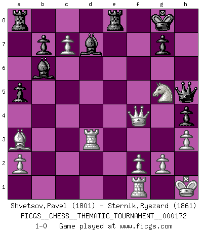 Last move : 1-0 2014 February 11 15:18:25 [Event "FICGS__CHESS__THEMATIC_TOURNAMENT__000172"] [Site "FICGS"] [Date "2013.12.23"] [Round "1"] [White "Shvetsov,Pavel"] [Black "Sternik,Ryszard"] [Result "1-0"] [WhiteElo "1801"] [BlackElo "1861"] 1.e4 e5 2.Nf3 Nc6 3.Bc4 Bc5 4.b4 Bxb4 5.c3 Ba5 6.d4 exd4 7.O-O dxc3 8.Qb3 Qf6 9.e5 Qg6 10.Nxc3 Nge7 11.Ba3 O-O 12.Rad1 Re8 13.Ne4 Nf5 14.Neg5 Nd8 15.Qa4 Bb6 16.Bd3 Ne6 17.Nxe6 fxe6 18.Kh1 h5 19.h3 Qh7 20.Qf4 Qg6 21.Bc2 Qh6 22.Ng5 h4 23.Bxf5 exf5 24.Qxf5 Qh5 25.Qf4 a5 26.Rd3 d5 27.exd6 Bd7 28.dxc7 1-0 Evans gambit : compromised defense Kingside Castling by player White (move 7) Kingside Castling by player Black (move 11) Player White won this chess game. Follow this game move after move (download)It is always better to sacrifice your opponent's men. (Savielly Tartakower) Ich habe die besten Aussichten, den ersten Preis zu gewinnen - denn jeder muss gegen Steinitz spielen, nur ich nicht! (Wilhelm Steinitz) El estómago es una parte esencial del maestro de Ajedrez. (Bent Larsen) Toutes choses étant égales, c'est la conviction qui gagne. Alliée à une volonté de vaincre, elle sert de détonateur, suscite des idées, disperse les doutes et aide à penser clairement. (Robert Fischer) You must do what you feel is right... of course. (Obi-Wan Kenobi in Star Wars ep.4)