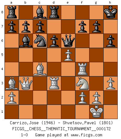 Last move : 1-0 2014 March 18 11:15:39 [Event "FICGS__CHESS__THEMATIC_TOURNAMENT__000172"] [Site "FICGS"] [Date "2013.12.23"] [Round "1"] [White "Carrizo,Jose"] [Black "Shvetsov,Pavel"] [Result "1-0"] [WhiteElo "1946"] [BlackElo "1801"] 1.e4 e5 2.Nf3 Nc6 3.Bc4 Bc5 4.b4 Bxb4 5.c3 Ba5 6.d4 exd4 7.O-O dxc3 8.Qb3 Qf6 9.e5 Qg6 10.Nxc3 Nge7 11.Ba3 O-O 12.Rad1 Re8 13.Nd5 Nxd5 14.Rxd5 Bb6 15.Bd3 Qg4 16.Re1 h6 17.h3 Qe6 18.Bc4 Rd8 19.Re4 d6 20.Rf4 Kh8 21.Rd3 1-0 Evans gambit : compromised defense Kingside Castling by player White (move 7) Kingside Castling by player Black (move 11) Player White won this chess game. Follow this game move after move (download)Without error there can be no brilliancy. (Emanuel Lasker) Ohne Fehler kann es keine Brillanz geben. (Emanuel Lasker) Jugadores de primera clase pierden en contra de jugadores de segunda clase porque los jugadores de segunda clase a veces juegan una partida de primer clase. (Siegbert Tarrasch) Il n'y a plus de joueurs du niveau de Jacob Murray dont la seule quête est le beau jeu, le plaisir de voir les pièces construire quelque chose. Sur 10 idées à la minute, 9 seront sans intérêt, la dernière s'avèrera géniale. (Christian Bauer) Before all elsed, be armed. (Niccolo Machiavelli)