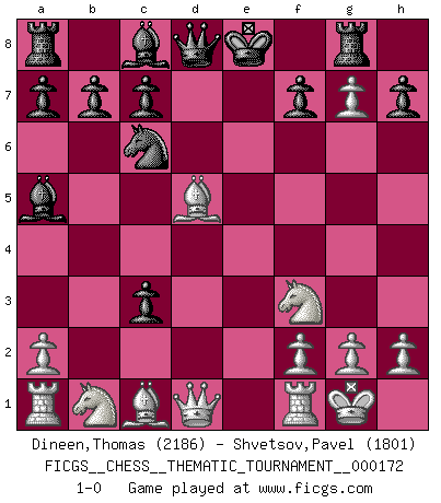 Last move : 1-0 2014 January 11 5:56:38 [Event "FICGS__CHESS__THEMATIC_TOURNAMENT__000172"] [Site "FICGS"] [Date "2013.12.23"] [Round "1"] [White "Dineen,Thomas"] [Black "Shvetsov,Pavel"] [Result "1-0"] [WhiteElo "2186"] [BlackElo "1801"] 1.e4 e5 2.Nf3 Nc6 3.Bc4 Bc5 4.b4 Bxb4 5.c3 Ba5 6.d4 exd4 7.O-O Nf6 8.e5 d5 9.exf6 dxc3 10.fxg7 Rg8 11.Bxd5 1-0 Evans gambit Kingside Castling by player White (move 7) Player White won this chess game. Follow this game move after move (download)A win by an unsound combination, however showy, fills me with artistic horror. (Wilhelm Steinitz) Wenn Dein Gegner dir ein Remis anbietet, versuch herauszufinden, weshalb er glaubt schlechter zu stehen. (Nigel Short) Tu eres para mi la Reina en d8 y yo soy el Peón en d7!!. (GM Eduard Gufeld) On a dit que l'homme se distingue de l'animal par le fait qu'il achète plus de livres qu'il ne peut en lire. Je voudrais suggérer qu'inclure à la liste des livres quelques livres d'échecs rendrait la distinction manifeste. (Edward Lasker) Who needs drugs and alcohol if he can play Big Chess at FICGS ? (Heinz-Georg Lehnhoff)
