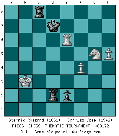 Last move : 0-1 2014 June 4 18:45:25 [Event "FICGS__CHESS__THEMATIC_TOURNAMENT__000172"] [Site "FICGS"] [Date "2013.12.23"] [Round "1"] [White "Sternik,Ryszard"] [Black "Carrizo,Jose"] [Result "0-1"] [WhiteElo "1861"] [BlackElo "1946"] 1.e4 e5 2.Nf3 Nc6 3.Bc4 Bc5 4.b4 Bxb4 5.c3 Ba5 6.d4 d6 7.dxe5 dxe5 8.Qxd8+ Nxd8 9.Nxe5 Be6 10.O-O f6 11.Bxe6 Nxe6 12.Nc4 Bb6 13.Rd1 Ne7 14.Nba3 Kf7 15.Nc2 Rad8 16.Be3 Bxe3 17.N4xe3 Nc5 18.f3 Ng6 19.Kf1 Ne5 20.Rd4 Ne6 21.Rb1 Nxd4 22.cxd4 Nc6 23.Rxb7 Nxd4 24.Rxc7+ Ke6 25.Nxd4+ Rxd4 26.Rxa7 Rd7 27.Ra6+ Kf7 28.Nc4 Rhd8 29.a4 Rc7 30.Nd6+ Ke7 31.Nf5+ Kf8 32.Kf2 R8d7 33.Ra8+ Kf7 34.Rh8 h6 35.g4 Ra7 36.h4 Rxa4 37.h5 Ra1 38.Rc8 Rad1 39.Ke3 Rd8 40.Rc3 R1d7 41.Ra3 Kg8 42.f4 Re8 43.Ra1 Rb7 44.Ra3 Reb8 45.Nd4 Rb1 46.e5 Re1+ 47.Kf2 Re4 48.Ne6 fxe5 49.Ra7 Kh8 50.Kf3 Rc4 51.g5 e4+ 52.Ke3 Rb3+ 53.Ke2 Rc2+ 54.Kd1 Rcb2 55.Rf7 Rd3+ 56.Kc1 Rb8 57.gxh6 gxh6 58.Rf6 e3 59.Rxh6+ Kg8 60.Rg6+ Kf7 61.Ng5+ Ke7 62.Re6+ Kd7 63.Kc2 Rd2+ 64.Kc3 Rc8+ 65.Kb3 e2 0-1 Evans gambit Kingside Castling by player White (move 10) 10 pieces endgame at move 57 : White KRNPP , Black KRRPP WHITE : King + 1 Rook 1 Knight 2 Pawns BLACK : King + 2 Rooks 2 Pawns 9 pieces endgame at move 59 : White KRNPP , Black KRRP WHITE : King + 1 Rook 1 Knight 2 Pawns BLACK : King + 2 Rooks 1 Pawn Player Black won this chess game. Follow this game move after move (download)First-class players lose to second-class players because second-class players sometimes play a first-class game. (Siegbert Tarrasch) Schach ist Kampf, hauptsächlich jedoch gegen die eigenen Fehler. (Savielly Grigorievitsch Tartakower) Todos los jugadores de Ajedrez deberían tener un pasatiempo. (Savielly Tartakower) Plusieurs personnes se sont demandées comment Tal faisait pour gagner... En fait, c'est très simple ! Il met ses pièces au centre de l'échiquier et les sacrifie quelque part ! (David Bronstein) Home computers are being called upon to perform many new functions, including the consumption of homework formerly eaten by the dog. (Doug Larson)