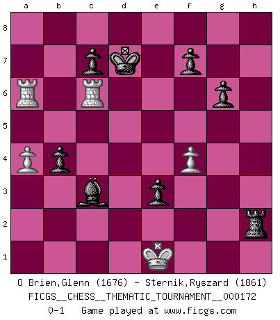 Last move : 0-1 2014 February 25 8:43:50 [Event "FICGS__CHESS__THEMATIC_TOURNAMENT__000172"] [Site "FICGS"] [Date "2013.12.23"] [Round "1"] [White "O Brien,Glenn"] [Black "Sternik,Ryszard"] [Result "0-1"] [WhiteElo "1676"] [BlackElo "1861"] 1.e4 e5 2.Nf3 Nc6 3.Bc4 Bc5 4.b4 Bxb4 5.c3 Ba5 6.d4 exd4 7.O-O dxc3 8.Qb3 Qf6 9.e5 Qg6 10.Nxc3 Nge7 11.Ba3 O-O 12.Rad1 Re8 13.Bd3 Qh5 14.Ne4 Nxe5 15.Nxe5 Qxe5 16.Bb2 Qe6 17.Qb5 Nc6 18.Ng5 Qh6 19.Bxh7+ Kf8 20.Be4 Bb6 21.Rd3 d6 22.Nh7+ Kg8 23.Rg3 Re5 24.Bxe5 dxe5 25.Ng5 Be6 26.Nxe6 Qxe6 27.Bd5 Nd4 28.Qc4 Ne2+ 29.Qxe2 Qxd5 30.Rh3 g6 31.Rd1 Bd4 32.Qd2 Re8 33.Qh6 e4 34.Qh7+ Kf8 35.Qh8+ Bxh8 36.Rxd5 Be5 37.Ra3 a6 38.Rb3 b5 39.Ra3 Re6 40.Rd8+ Ke7 41.Ra8 Rc6 42.f3 Bb2 43.R3xa6 Bd4+ 44.Kf1 Rc1+ 45.Ke2 e3 46.Kd3 Rd1+ 47.Ke2 Rd2+ 48.Ke1 Rxg2 49.Rc6 Kd7 50.R8a6 Rxh2 51.f4 b4 52.a4 Bc3+ 0-1 Evans gambit : compromised defense Kingside Castling by player White (move 7) Kingside Castling by player Black (move 11) Player Black won this chess game. Follow this game move after move (download)The most powerful weapon in Chess is to have the next move. (David Bronstein) Ich organisiere ein großes Turnier, was mich etwa 120000 Dollar kostet. Ich denke, das ist das erste Mal in der Schachgeschichte, daß ein Schachgroßmeister auch als Mäzen auftritt. (Miguel Najdorf) Una compensación adecuada por un sacrificio es tener una combinación sólida que conduce a una posición ganadora; una compensación adecuada por una metida de pata es dejar a tu oponente arrebatar una derrota de las fauces de la victoria. (Bruce A. Moon) Echiquier : carré parfait, comme la Jérusalem nouvelle décrite par l'auteur de l'Apocalypse, huit cases sur huit, exaltation du chiffre 4, symbole du cosmos aux quatre horizons... où le noir et le blanc, l'ombre et la lumière, le mal et le bien s'entremêlent et se conjuguent. (Robert Couffignal, Le Gambit du poète) For peace of mind, resign as general manager of the universe. (Douglas Adams)