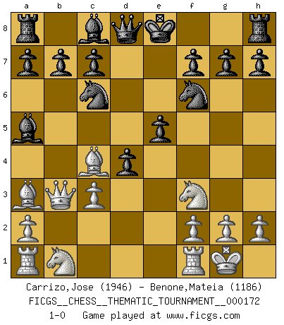 Last move : 1-0 2014 March 5 13:18:6 [Event "FICGS__CHESS__THEMATIC_TOURNAMENT__000172"] [Site "FICGS"] [Date "2013.12.23"] [Round "1"] [White "Carrizo,Jose"] [Black "Benone,Mateia"] [Result "1-0"] [WhiteElo "1946"] [BlackElo "1186"] 1.e4 e5 2.Nf3 Nc6 3.Bc4 Bc5 4.b4 Bxb4 5.c3 Ba5 6.d4 exd4 7.O-O Nf6 8.Ba3 d6 9.e5 dxe5 10.Qb3 1-0 Evans gambit Kingside Castling by player White (move 7) Player White won this chess game. Follow this game move after move (download)A thorough understanding of the typical mating continuations makes the most complicated sacrificial combinations leading up to them not only not difficult, but almost a matter of course. (Siegbert Tarrasch) Jeder weiß, dass Gasprom Putins persönliches Machtinstrument ist. Die Firma wird vom Kreml aus geleitet und wird schon deshalb nie transparent sein. (Garry Kasparov) Los finales de Peón son del Ajedrez lo que el cesped es del Golf. (Cecil Purdy) Ne tendez aucun piège pour le plaisir ! Ne jouez rien dans l'espoir que l'adversaire réagisse de façon stupide ! Prenez toujours pour acquis que l'adversaire va trouver le meilleur coup ! Ne jouez jamais de coup dans l'espoir que l'adversaire ne voie pas la menace ! Chacun de vos coups doit améliorer la position d'une façon ou d'une autre. Beta. Software undergoes beta testing shortly before it's released. Beta is latin for still doesn't work. (Anonymous)