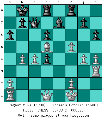 Last move : 0-1 2007 September 9 1:33:23 [Event "FICGS__CHESS__CLASS_C__000029"] [Site "FICGS"] [Date "2007.02.11"] [Round "1"] [White "Regent,Mike"] [Black "Ionescu,Catalin"] [Result "0-1"] [WhiteElo "1700"] [BlackElo "1600"] 1.e4 c5 2.Nf3 d6 3.d4 cxd4 4.Nxd4 Nf6 5.Nc3 a6 6.Bc4 e5 7.Nf5 Bxf5 8.exf5 Nc6 9.g4 h6 10.h4 Nd4 11.Be3 Qb6 12.Bb3 O-O-O 13.Bxf7 Kb8 14.Rh3 Be7 15.Kf1 Rhf8 16.Nd5 Nxd5 17.Bxd4 exd4 18.Bxd5 Qb5+ 19.c4 Qc5 20.b4 Qc7 0-1 Sicilian : Najdorf, Lipnitzky attack Queenside Castling by player Black (move 12) Player Black won this chess game. Follow this game move after move (download)There are two types of sacrifices: correct ones and mine. (Mikhail Tal) Schach verlangt totale Konzentration. (Robert James Fischer) Ayuda a tus piezas para que ellas te puedan ayudar. (Paul Morphy) On croit qu'il y a plus de mauvais joueurs que de bons joueurs, c'est faux : Il y a autant de joueurs qui gagnent que de joueurs qui perdent. (Philippe Geluck) Nothing is more important for teaching us to understand the concepts we have than constructing fictitious ones. (Ludwig Wittgenstein)