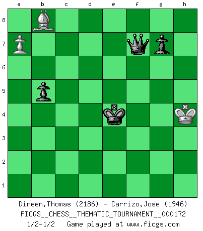 Last move : 1/2-1/2 2014 October 4 15:28:12 [Event "FICGS__CHESS__THEMATIC_TOURNAMENT__000172"] [Site "FICGS"] [Date "2013.12.23"] [Round "1"] [White "Dineen,Thomas"] [Black "Carrizo,Jose"] [Result "1/2-1/2"] [WhiteElo "2186"] [BlackElo "1946"] 1.e4 e5 2.Nf3 Nc6 3.Bc4 Bc5 4.b4 Bxb4 5.c3 Ba5 6.d4 d6 7.Qb3 Qd7 8.dxe5 Bb6 9.Nbd2 dxe5 10.O-O Na5 11.Qb4 Nxc4 12.Nxc4 f6 13.a4 a5 14.Qb3 Bc5 15.Ncxe5 fxe5 16.Nxe5 Qe7 17.Qb5+ Kf8 18.Nd3 b6 19.Nxc5 bxc5 20.Ba3 Kf7 21.Qc6 Ra6 22.Qd5+ Re6 23.f4 Nf6 24.Qb3 Ke8 25.Qb8 Qd8 26.e5 Nd7 27.Qa8 Rf8 28.Qd5 Qe7 29.Qa8 Kf7 30.Qxa5 Rb6 31.c4 Kg8 32.Qc3 Qh4 33.a5 Rg6 34.Qf3 Nxe5 35.Qd5+ Nf7 36.Bxc5 Rd8 37.Rfe1 h5 38.Qe4 Re6 39.Bf2 Qf6 40.Qf3 Rde8 41.c5 Qf5 42.Rxe6 Rxe6 43.Qa8 Kh7 44.Qxc8 Re1+ 45.Bxe1 Qxc8 46.a6 Nd8 47.a7 Qa8 48.Bf2 Nc6 49.Be3 Kg6 50.h3 Kf5 51.g3 Ke4 52.Bf2 Kd3 53.Ra3+ Kc2 54.Ra4 Kb3 55.Ra1 Nb4 56.f5 c6 57.Ra5 Nd5 58.g4 hxg4 59.hxg4 Nc7 60.Bg3 Nb5 61.Bb8 Kb4 62.Ra1 Kxc5 63.g5 Kd5 64.Ra5 Ke4 65.Rxb5 cxb5 66.f6 Qd5 67.f7 Qxg5+ 68.Kh2 Qh5+ 69.Kg3 Qf3+ 70.Kh4 Qxf7 1/2-1/2 Evans gambit : Tartakower attack Kingside Castling by player White (move 10) 10 pieces endgame at move 65 : White KRBPPP , Black KQPP WHITE : King + 1 Rook 1 Bishop 3 Pawns BLACK : King + 1 Queen 2 Pawns 9 pieces endgame at move 65 : White KBPPP , Black KQPP WHITE : King + 1 Bishop 3 Pawns BLACK : King + 1 Queen 2 Pawns 8 pieces endgame at move 67 : White KBPP , Black KQPP WHITE : King + 1 Bishop 2 Pawns BLACK : King + 1 Queen 2 Pawns 7 pieces endgame at move 70 : White KBP , Black KQPP WHITE : King + 1 Bishop 1 Pawn BLACK : King + 1 Queen 2 Pawns This chess game ended in a draw. Follow this game move after move (download)Checkers is for tramps. (Paul Morphy) Capablanka war das größte Genie der Schachgeschichte! Aber denken sie nicht er habe nichts vom Schach verstanden. Er wusste nur soviel wie er wissen musste um seine Ziele zu erreichen. (Mikhail Moiseyevich Botvinik) Tu cuerpo tiene que estar en óptima condición. Tu Ajedrez se deteriora como lo hace tu cuerpo. No puedes separar la mente y el cuerpo. (Bobby Fischer) La solitude du joueur d'Echecs à l'approche du mat est semblable à celle du condamné. (Francis Szpiner) O divine art of subtlety and secrecy! Through you we learn to be invisible, through you inaudible and hence we can hold the enemy's fate in our hands. (Sun Tzu)