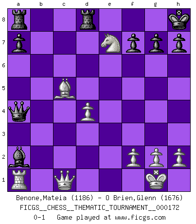 Last move : 0-1 2014 April 12 20:12:2 [Event "FICGS__CHESS__THEMATIC_TOURNAMENT__000172"] [Site "FICGS"] [Date "2013.12.23"] [Round "1"] [White "Benone,Mateia"] [Black "O Brien,Glenn"] [Result "0-1"] [WhiteElo "1186"] [BlackElo "1676"] 1.e4 e5 2.Nf3 Nc6 3.Bc4 Bc5 4.b4 Bxb4 5.c3 Ba5 6.O-O Nf6 7.d4 exd4 8.Ba3 d6 9.e5 Ne4 10.cxd4 O-O 11.Bd5 Bf5 12.Qa4 Bb6 13.Bxc6 bxc6 14.Qxc6 Qe8 15.Qc1 Ba5 16.Nbd2 Nxd2 17.Nxd2 Qa4 18.Nb3 Bd3 19.Nxa5 Bxf1 20.Nc6 Bc4 21.Ne7+ Kh8 22.exd6 cxd6 23.Bxd6 Rfd8 24.Bc5 Bxa2 0-1 Evans gambit Kingside Castling by player White (move 6) Kingside Castling by player Black (move 10) Player Black won this chess game. Follow this game move after move (download)Chess is a more highly symbolic game, but the aggressions are therefore even more frankly represented in the play. It probably began as a war game; that is, the representation of a miniature battle between the forces of two kingdoms. (Karl Meninger) Früher wurde jeder komplizierte Zug, jedes interessante Opfer mit großem Beifall und Enthusiasmus aufgenommen. Heute schaltet man einfach seinen Fritz an, und man kann sehen, was los ist, ob der Zug geht oder nicht. (Vladimir Kramnik) Uno por uno, yo los acribillé, mi superioridad muy pronto se volvio aparente. (Jose Capablanca) Vouloir jouer aux échecs contre soi-même est aussi paradoxal que vouloir marcher sur son ombre. (Stefan Zweig) The obstacle is the path. (Zen proverb)