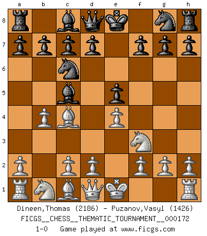 Last move : 1-0 2014 February 2 0:15:29 [Event "FICGS__CHESS__THEMATIC_TOURNAMENT__000172"] [Site "FICGS"] [Date "2013.12.23"] [Round "1"] [White "Dineen,Thomas"] [Black "Puzanov,Vasyl"] [Result "1-0"] [WhiteElo "2186"] [BlackElo "1426"] 1.e4 e5 2.Nf3 Nc6 3.Bc4 Bc5 4.b4 1-0 This chess game has been lost on time (started : 2013.12.23 15:30:19) Evans gambit declined Player White won this chess game. Follow this game move after move (download)In Chess, at least, the brave inherit the earth. (Edmar Mednis) Strategie ist, wie man ein Mädchen auf den Rücksitz bekommt. Taktik ist, was man tut, wenn man dann dort ist. (Anonymous) Cuando la partida de Ajedrez termina, el Peón y el Rey regresan a la misma caja. (Irish saying) Les sacrifices démontrent seulement que quelqu'un a gaffé. (Savielly Tartacover) The real voyage of discovery consists not in seeking new lands but in seeing with new eyes. (Marcel Proust)