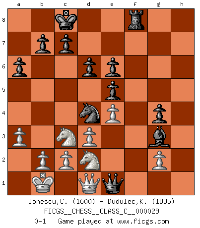 Last move : 0-1 2007 May 17 16:10:14 [Event "FICGS__CHESS__CLASS_C__000029"] [Site "FICGS"] [Date "2007.02.11"] [Round "1"] [White "Ionescu,Catalin"] [Black "Dudulec,Konstantin"] [Result "0-1"] [WhiteElo "1600"] [BlackElo "1835"] 1.e4 e5 2.Nf3 Nc6 3.Bc4 Bc5 4.d3 Nf6 5.Bg5 h6 6.Bh4 d6 7.h3 g5 8.Bg3 a6 9.Nc3 Be6 10.Bxe6 fxe6 11.a3 Qe7 12.Qd2 O-O-O 13.O-O-O Rhf8 14.Rde1 Nh5 15.Rhf1 Nxg3 16.fxg3 Rf7 17.Kb1 Rdf8 18.Qd1 h5 19.Nh2 Bf2 20.Re2 Bxg3 21.Rxf7 Qxf7 22.Nf3 g4 23.hxg4 hxg4 24.Nd2 Nd4 25.Re3 Qf2 26.Re1 Qxe1 0-1 Giuoco Pianissimo Queenside Castling by player Black (move 12) Queenside Castling by player White (move 13) Player Black won this chess game. Follow this game move after move (download)Pawns are born free, yet they are everywhere in chains. (Rick Kennedy) Gott hat gewollt, dass ich Champion werde. (Surab Azmajparaschvili) Aquellos que dicen que entienden al Ajedrez, no entienden nada. (Robert Hubner) La menace est plus forte que l'exécution. (Aaron Nimzovitch) Without deviation from the norm, progress is not possible. (Frank Zappa)