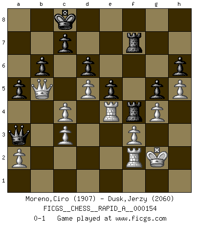 Last move : 0-1 2014 June 4 10:41:30 [Event "FICGS__CHESS__RAPID_A__000154"] [Site "FICGS"] [Date "2013.12.25"] [Round "1"] [White "Moreno,Ciro"] [Black "Dusk,Jerzy"] [Result "0-1"] [WhiteElo "1907"] [BlackElo "2060"] 1.d4 Nf6 2.c4 e6 3.Nf3 b6 4.Bg5 Bb7 5.Nc3 Bb4 6.e3 h6 7.Bxf6 Qxf6 8.Be2 Bxc3+ 9.bxc3 O-O 10.O-O d6 11.Nd2 Nd7 12.Qc2 e5 13.Bd3 Qe7 14.Rfe1 Nf6 15.Ne4 Rae8 16.Nxf6+ Qxf6 17.d5 Bc8 18.f3 Qg5 19.Re2 f5 20.Rf1 Bd7 21.R2e1 f4 22.Bh7+ Kh8 23.Bg6 Rb8 24.Qd3 fxe3 25.Rxe3 Rf4 26.Be4 Rbf8 27.Re2 a5 28.Kh1 Bf5 29.g3 Bxe4 30.Rxe4 R4f7 31.Kg2 Rf5 32.Rg4 Qf6 33.Re4 g5 34.h4 Qg6 35.h5 Qe8 36.g4 R5f6 37.Kg1 Kg7 38.Re3 Qa4 39.Re2 R8f7 40.Kh2 Kf8 41.R1f2 Ke7 42.Kg2 Qa3 43.Re4 Qc5 44.Qb1 Kd7 45.Qb5+ Kc8 46.Rf1 Rf4 47.Rf2 Qa3 0-1 This chess game has been lost on time (started : 2013.12.25 20:27:2) Queen's Indian defense Kingside Castling by player Black (move 9) Kingside Castling by player White (move 10) Player Black won this chess game. Follow this game move after move (download)Fischer, who may or may not be mad as a hatter, has every right to be horrified. (Jeremy Silman) Alles was ich jemals tun will ist Schach spielen. (Robert James Fischer) A través de las casillas del tablero, los Indios explican el movimiento del tiempo y la edad, las influencias mas altas que controlan el mundo y los lazos que vinculan al Ajedrez con el alma humana. (Al-Masudi) L'action d'une oeuvre littéraire se déroule sur un champ de bataille. Les masques et les types du drame moderne correspondent aux pièces du jeu d'échecs. L'intrigue correspond aux coups et aux gambits, c'est à dire aux techniques du jeu telles qu'utilisées et interprétées par les joueurs. Les tactiques et les péripéties [mouvements] correspondent aux coups exécutés par l'adversaire. (Viktor Shklovsky) When it is a question of money, everybody is of the same religion. (Voltaire)