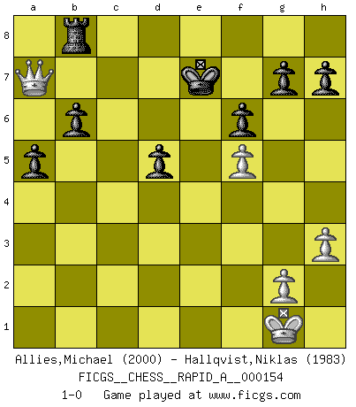 Last move : 1-0 2014 March 22 9:25:35 [Event "FICGS__CHESS__RAPID_A__000154"] [Site "FICGS"] [Date "2013.12.25"] [Round "1"] [White "Allies,Michael"] [Black "Hallqvist,Niklas"] [Result "1-0"] [WhiteElo "2000"] [BlackElo "1983"] 1.e4 e6 2.d4 d5 3.Nc3 Bb4 4.e5 c5 5.a3 Bxc3+ 6.bxc3 Qa5 7.Bd2 Qa4 8.Qg4 Kf8 9.Nf3 Ne7 10.h3 Qxc2 11.Rc1 Qb2 12.dxc5 Qxa3 13.Bd3 Nbc6 14.O-O Qxc5 15.Be3 Qa5 16.c4 Qc7 17.Bc5 a5 18.cxd5 exd5 19.Qg3 Qd8 20.Nd4 Nxd4 21.Bxd4 Be6 22.f4 Bf5 23.Bc5 Bxd3 24.Qxd3 b6 25.Bd6 Ra7 26.Rf2 Rd7 27.f5 Rxd6 28.exd6 Qxd6 29.Qa6 Qb8 30.Rfc2 f6 31.Rc8+ Nxc8 32.Rxc8+ Ke7 33.Rxb8 Rxb8 34.Qa7+ 1-0 French : Winawer, Advance variation Kingside Castling by player White (move 14) Player White won this chess game. Follow this game move after move (download)Chess is ruthless: you've got to be prepared to kill people. (Nigel Short) Nicht daß Diemer aus Opportunismus Mitglied der NSDAP geworden wäre. Er war ein Fanatiker, in allem, was er tat. (Hans Ree) Un buen sacrificio es aquel que aunque no sea necesariamente sólido, deja a tu oponente aturdido y confuso. (Rudolph Spielmann) Vous m'avez demandé de vous exposer quel est le fondement de la prière. Je ne fais que préparer les pièces du jeu sur la table... Nous sera-t-il permis d'en adopter les règles et si nous les appliquons scrupuleusement nous ne tarderons pas à faire mat le Roi divin ! Il ne pourra échapper à nos mains. (Sainte Thérèse d'Avila, Chemin de perfection) Pushing plastic is for the many, pushing virtual pieces is for the fewer, pushing wood is for the very few. (Normajean Yates)