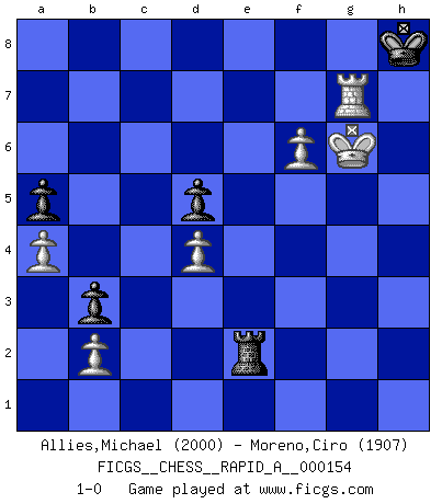 Last move : 1-0 2014 May 23 2:21:38 [Event "FICGS__CHESS__RAPID_A__000154"] [Site "FICGS"] [Date "2013.12.25"] [Round "1"] [White "Allies,Michael"] [Black "Moreno,Ciro"] [Result "1-0"] [WhiteElo "2000"] [BlackElo "1907"] 1.e4 c5 2.c3 g6 3.Nf3 Bg7 4.d4 cxd4 5.cxd4 d5 6.e5 Bg4 7.Bb5+ Nd7 8.O-O a6 9.Be2 e6 10.Bg5 Qb6 11.Nc3 Bh6 12.Na4 Qa7 13.Be3 Bxf3 14.Bxf3 Bxe3 15.fxe3 b5 16.Nc3 Ne7 17.Qd2 O-O 18.a4 b4 19.Ne2 a5 20.Rac1 Rac8 21.Nf4 Rxc1 22.Rxc1 h5 23.Qf2 Rc8 24.Rf1 Nf5 25.g4 hxg4 26.Bxg4 Qc7 27.Bxf5 gxf5 28.Qg3+ Kf8 29.Nh5 b3 30.Qg7+ Ke7 31.Qg5+ Kf8 32.Rf2 Qd8 33.Nf6 Nxf6 34.exf6 Qd6 35.h4 Rc1+ 36.Kg2 Ke8 37.h5 Rc2 38.Qh4 f4 39.Qxf4 Qxf4 40.exf4 Kf8 41.Kf3 Kg8 42.Rg2+ Kh8 43.Rg7 Rh2 44.Rxf7 Rxh5 45.Kg4 Rf5 46.Re7 Rxf6 47.Kg5 Rf8 48.Rxe6 Rf7 49.Rh6+ Kg8 50.Rg6+ Kh7 51.f5 Re7 52.f6 Re2 53.Rg7+ Kh8 54.Kg6 1-0 Sicilian : Alapin's variation (2.c3) Kingside Castling by player White (move 8) Kingside Castling by player Black (move 17) Player White won this chess game. Follow this game move after move (download)I prefer to lose a really good game than to win a bad one. (David Levy) Schach ist ein schwarz-weisser Dschungel. (Garry Kasparov) Tu cuerpo tiene que estar en óptima condición. Tu Ajedrez se deteriora como lo hace tu cuerpo. No puedes separar la mente y el cuerpo. (Bobby Fischer) Les ravages du H expliquent la différence de niveau entre Tal et Thal [Abergel]. Don't be discouraged. It's often the last key in the bunch that opens the lock. (Author unknown)