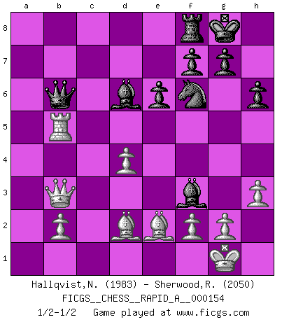 Last move : 1/2-1/2 2014 March 22 9:48:11 [Event "FICGS__CHESS__RAPID_A__000154"] [Site "FICGS"] [Date "2013.12.25"] [Round "1"] [White "Hallqvist,Niklas"] [Black "Sherwood,Russell"] [Result "1/2-1/2"] [WhiteElo "1983"] [BlackElo "2050"] 1.e4 c5 2.c3 d5 3.exd5 Qxd5 4.Na3 Nf6 5.Nf3 Nc6 6.Bc4 Qd8 7.O-O a6 8.Nc2 Bg4 9.d4 cxd4 10.Ncxd4 Nxd4 11.cxd4 e6 12.Qb3 b5 13.Be2 Bd6 14.h3 Bh5 15.a4 O-O 16.axb5 axb5 17.Bg5 Rxa1 18.Rxa1 h6 19.Bd2 Qb6 20.Ra5 Bxf3 21.Rxb5 1/2-1/2 Sicilian : Alapin's variation (2.c3) Kingside Castling by player White (move 7) Kingside Castling by player Black (move 15) This chess game ended in a draw. Follow this game move after move (download)My God, Bobby Fischer plays so simply. (Alexei Suetin) Ich glaube, ich kenne inzwischen die Gründe für mein Versagen: schachliche Charakterfehler. Ich war nie ein Wunderkind und in meiner gesamten menschlichen Entwicklung immer zu langsam. (Viktor Kortschnoi) Fischer es el jugador mas fuerte del mundo. De hecho, el jugador mas fuerte que jamas haya existido. (Larry Evans) Le profane ne songe pas à la somme de jouissance dont il se prive, qui méconnaît ce jeu aux ressources aussi variées que passionnantes. (Jean-Marie Jeanton-Lamarche) Men never do evil so completely and cheerfully as when they do it from religious conviction. (Blaise Pascal)