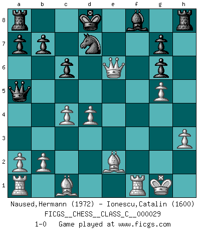 Last move : 1-0 2007 June 30 21:7:28 [Event "FICGS__CHESS__CLASS_C__000029"] [Site "FICGS"] [Date "2007.02.11"] [Round "1"] [White "Naused,Hermann"] [Black "Ionescu,Catalin"] [Result "1-0"] [WhiteElo "1972"] [BlackElo "1600"] 1.d4 Nf6 2.Nc3 d5 3.e4 dxe4 4.f3 exf3 5.Nxf3 Bg4 6.h3 Bh5 7.g4 Bg6 8.Ne5 e6 9.Qf3 c6 10.g5 Bh5 11.Qf2 Nd5 12.Be2 Bg6 13.Nxd5 Qxd5 14.O-O Nd7 15.c4 Qa5 16.Nxg6 hxg6 17.Qxf7+ Kd8 18.Qxe6 1-0 Queen's pawn game Kingside Castling by player White (move 14) Player White won this chess game. Follow this game move after move (download)A win by an unsound combination, however showy, fills me with artistic horror. (Wilhelm Steinitz) Wenn Dein Gegner dir ein Remis anbietet, versuch herauszufinden, weshalb er glaubt schlechter zu stehen. (Nigel Short) Coloca el contenido del tablero de Ajedrez en un sombrero, agita las piezas vigorosamente, derrámalas en el tablero desde una altura de medio metro y así obtienes el estilo de Wilhelm Steinitz. (H. E. Bird) On a dit que l'homme se distingue de l'animal par le fait qu'il achète plus de livres qu'il ne peut en lire. Je voudrais suggérer qu'inclure à la liste des livres quelques livres d'échecs rendrait la distinction manifeste. (Edward Lasker) If passion drives you, let reason holds the reins. (Benjamin Franklin)