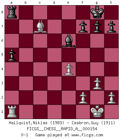 Last move : 0-1 2014 March 27 0:4:17 [Event "FICGS__CHESS__RAPID_A__000154"] [Site "FICGS"] [Date "2013.12.25"] [Round "1"] [White "Hallqvist,Niklas"] [Black "Cesbron,Guy"] [Result "0-1"] [WhiteElo "1983"] [BlackElo "1911"] 1.d4 d5 2.g3 Nf6 3.Bg2 e6 4.Nf3 Be7 5.O-O O-O 6.c4 dxc4 7.Ne5 Nc6 8.Bxc6 bxc6 9.Nxc6 Qe8 10.Nxe7+ Qxe7 11.Qa4 e5 12.dxe5 Qxe5 13.Nc3 Ne4 14.Qxc4 Nxc3 15.bxc3 Be6 16.Qd3 Rfd8 17.Bf4 Rxd3 18.Bxe5 Rd2 19.e4 Bxa2 20.Bxc7 a5 21.c4 Bxc4 22.Rfc1 Ra2 23.Rxa2 Bxa2 24.Ra1 Be6 0-1 Queen's pawn game Kingside Castling by player White (move 5) Kingside Castling by player Black (move 5) Player Black won this chess game. Follow this game move after move (download)Chess is the gymnasium of the mind. (Blaise Pascal) Kasparov ist eine Art Monster mit hundert Augen, denen auch nicht das Geringste entgeht. (Tony Miles) Un buen jugador siempre tiene buena suerte. (José Raúl Capablanca) Le système Elo représente seulement une moyenne. Il est simplement un indicateur de votre stabilité. (Anatoli Karpov) Strategy without tactics is the slowest route to victory. Tactics without strategy is the noise before defeat. (Sun Tzu)