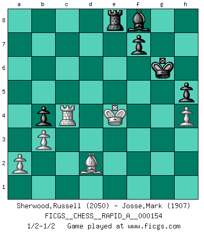 Last move : 1/2-1/2 2014 March 31 8:5:11 [Event "FICGS__CHESS__RAPID_A__000154"] [Site "FICGS"] [Date "2013.12.25"] [Round "1"] [White "Sherwood,Russell"] [Black "Josse,Mark"] [Result "1/2-1/2"] [WhiteElo "2050"] [BlackElo "1907"] 1.e4 c5 2.Nf3 d6 3.d4 cxd4 4.Nxd4 Nf6 5.Nc3 Nbd7 6.Be3 a6 7.Be2 e6 8.g4 h6 9.f4 g5 10.f5 e5 11.Nb3 b5 12.Qd3 Bb7 13.O-O-O b4 14.Nd5 Nxd5 15.exd5 a5 16.Rhe1 Qc7 17.Nd2 Ba6 18.Qb3 Bxe2 19.Rxe2 Be7 20.Qd3 Kf8 21.h3 Rc8 22.b3 a4 23.Kb1 Kg7 24.Nc4 Ra8 25.Qd2 Nf6 26.Qd3 Rab8 27.Red2 Rhc8 28.h4 Nxg4 29.Bxg5 axb3 30.cxb3 Nf6 31.Rc1 Kh7 32.Rdc2 Qd8 33.Qf3 e4 34.Qe2 Qd7 35.Bd2 Rc5 36.Ne3 Qb5 37.Rc4 Rxc4 38.Rxc4 Bf8 39.Bc1 Nxd5 40.Nxd5 Qxd5 41.Qxe4 Qxe4+ 42.Rxe4 d5 43.Rd4 Rb5 44.Rg4 d4 45.Rxd4 Rxf5 46.Bd2 Rb5 47.Kc2 h5 48.Kd3 Kg6 49.Ke4 Rb8 50.Rc4 Re8+ 1/2-1/2 Sicilian Queenside Castling by player White (move 13) This chess game ended in a draw. Follow this game move after move (download)On the chessboard, lies and hypocrisy do not survive long. (Emanuel Lasker) Ich verstehe Aljechins Kombinationen ganz gut; aber woher er diese Angriffschancen bekommt und wie er die Eröffnung behandelt das ist für mich ein Buch mit sieben Siegeln. (Rudolf Spielmann) Realmente no sabemos como el juego fue inventado, aunque hay sospechas. Tan pronto como descubramos a los culpables, se los haremos saber. (Bruce Pandolfini) Toute estimation doit être constamment réévaluée. (Jacob Estrin) Animated gif is worth one mega-word. (Unknown)