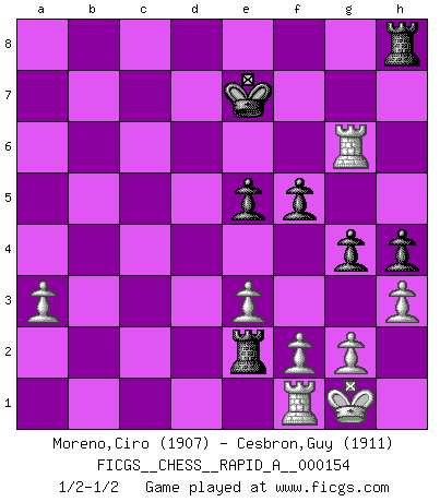Last move : 1/2-1/2 2014 March 25 1:8:0 [Event "FICGS__CHESS__RAPID_A__000154"] [Site "FICGS"] [Date "2013.12.25"] [Round "1"] [White "Moreno,Ciro"] [Black "Cesbron,Guy"] [Result "1/2-1/2"] [WhiteElo "1907"] [BlackElo "1911"] 1.d4 Nf6 2.c4 e6 3.Nf3 b6 4.Bg5 Bb7 5.Nc3 h6 6.Bxf6 Qxf6 7.a3 Nc6 8.e3 g5 9.Be2 g4 10.Nd2 h5 11.Rc1 O-O-O 12.c5 Kb8 13.b4 Qg6 14.O-O Bg7 15.Nb5 f5 16.Nxc7 Kxc7 17.cxb6+ axb6 18.b5 e5 19.d5 Kb8 20.dxc6 dxc6 21.bxc6 Bxc6 22.Qc2 h4 23.Qxc6 Qxc6 24.Rxc6 Rxd2 25.Rxb6+ Kc7 26.Rg6 Rxe2 27.Rxg7+ Kd6 28.Rg6+ Ke7 29.h3 1/2-1/2 Queen's Indian defense Queenside Castling by player Black (move 11) Kingside Castling by player White (move 14) This chess game ended in a draw. Follow this game move after move (download)You need not play well - just help your opponent to play badly. (Genrikh Chepukaitis) Wenn man heute mit 14 Jahren noch kein GM ist, kann man es vergessen. (Viswanathan Anand) No es tiempo de jugar al Ajedrez cuando la casa esta en llamas. (Proverbio Italiano) Les Echecs ne sont pas pour les âmes timides. Ils requièrent un homme entier, qui ne s'arrête pas aveuglément à ce qui a été déjà établi, mais qui tente individuellement de sonder les profondeurs du jeu. (W. Steinitz) You can only get smarter by playing a smarter opponent. (Revolver, movie)