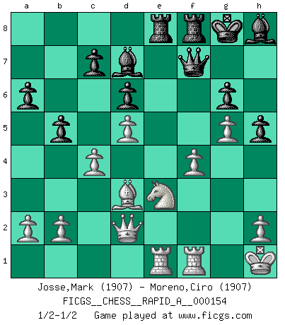 Last move : 1/2-1/2 2014 February 16 15:58:52 [Event "FICGS__CHESS__RAPID_A__000154"] [Site "FICGS"] [Date "2013.12.25"] [Round "1"] [White "Josse,Mark"] [Black "Moreno,Ciro"] [Result "1/2-1/2"] [WhiteElo "1907"] [BlackElo "1907"] 1.d4 Nf6 2.c4 g6 3.Nc3 Bg7 4.e4 d6 5.f3 O-O 6.Be3 e5 7.Nge2 Nbd7 8.Qd2 a6 9.d5 Nh5 10.g4 Nf4 11.Nxf4 exf4 12.Bxf4 Ne5 13.Be2 h5 14.g5 f5 15.O-O Qe7 16.Rae1 fxe4 17.Nxe4 Bf5 18.Nf2 Qf7 19.Bxe5 Bxe5 20.f4 Bh8 21.Bd3 Bd7 22.Nd1 Rae8 23.Ne3 b5 24.Kh1 1/2-1/2 King's Indian : Saemisch, Orthodox variation Kingside Castling by player Black (move 5) Kingside Castling by player White (move 15) This chess game ended in a draw. Follow this game move after move (download)The way he plays Chess demonstrates a man's whole nature. (Stanley Ellin) Man braucht nicht immer den besten Zug zu spielen: Ein Zug muß aktiv, unternehmungslustig, korrekt und schön sein. (David Bronstein) Mis oponentes también hacen buenas movidas. A veces yo no tomo esas cosas en consideración. (Bobby Fischer) Vous savez, camarade Pachman, je n'éprouve pas de plaisir à être ministre, je jouerais plutôt aux échecs comme vous, ou alors ferais une révolution au Venezuela. (Che Guevara à Ludek Pachman, 'Checkmate in Prague', 1975) When I took office, only high energy physicists had ever heard of what is called the World Wide Web... Now even my cat has its own page. (Bill Clinton, 1996)