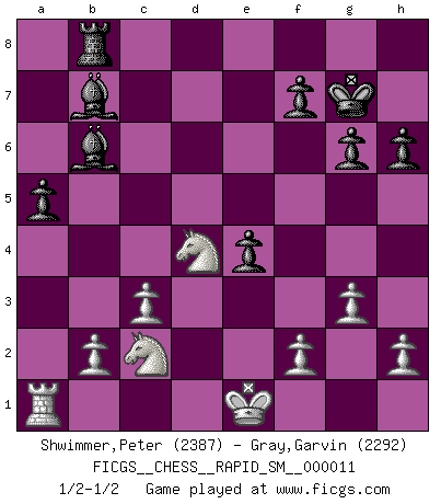 Last move : 1/2-1/2 2014 February 13 13:23:33 [Event "FICGS__CHESS__RAPID_SM__000011"] [Site "FICGS"] [Date "2013.12.26"] [Round "1"] [White "Shwimmer,Peter"] [Black "Gray,Garvin"] [Result "1/2-1/2"] [WhiteElo "2387"] [BlackElo "2292"] 1.e4 c5 2.c3 e6 3.d4 d5 4.exd5 exd5 5.Be3 cxd4 6.Bxd4 Nc6 7.Nf3 Nxd4 8.Nxd4 Bd6 9.Bb5+ Kf8 10.O-O g6 11.Nd2 Nf6 12.Re1 a6 13.Be2 Kg7 14.Nf1 Re8 15.Bf3 Rxe1 16.Qxe1 b5 17.Ne3 Bb7 18.Qd2 Qb6 19.g3 Bf8 20.Rd1 Ne4 21.Qc2 Re8 22.a4 bxa4 23.Qxa4 Rd8 24.Qc2 Kg8 25.Qb3 Bc5 26.Qxb6 Bxb6 27.Ra1 Kg7 28.Nec2 a5 29.Kf1 Rb8 30.Ke1 h6 31.Bxe4 dxe4 1/2-1/2 Sicilian : Alapin's variation (2.c3) Kingside Castling by player White (move 10) This chess game ended in a draw. Follow this game move after move (download)Life is like a game of Chess, changing with each move. (Chinese proverb) Ich liebe den Moment, wenn ich das Ego meines Gegenüber breche. (Robert James Fischer) Si el ingenio solamente fuese necesario para lucirse, las mujeres serían las mejores jugadoras de Ajedrez del mundo. (Albin) Que feriez-vous si vous étiez en train de jouer aux échecs et que la fin du monde arrive ? Je continuerais à jouer. (Saint Borromée) Statistics can be made to prove anything - even the truth. (Author unknown)