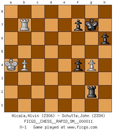 Last move : 0-1 2014 July 30 2:17:25 [Event "FICGS__CHESS__RAPID_SM__000011"] [Site "FICGS"] [Date "2013.12.26"] [Round "1"] [White "Alcala,Alvin"] [Black "Schutte,John"] [Result "0-1"] [WhiteElo "2306"] [BlackElo "2334"] 1.g3 e5 2.Nf3 e4 3.Nd4 c5 4.Nb3 c4 5.Nd4 Bc5 6.c3 Nf6 7.d3 cxd3 8.exd3 d5 9.Be3 exd3 10.Qxd3 Nbd7 11.Nd2 O-O 12.h3 Ne5 13.Qc2 Re8 14.O-O-O Bd7 15.g4 Rc8 16.Kb1 a5 17.Be2 Bxd4 18.Bxd4 Nc6 19.Nf3 Qe7 20.Bd3 Nb4 21.Qc1 Ne4 22.Ne1 Nc6 23.Bb6 d4 24.Qf4 dxc3 25.Qxe4 Qxe4 26.Bxe4 Rxe4 27.Rxd7 Rb4 28.Nd3 Rxb6 29.b3 g6 30.Re1 c2+ 31.Kb2 a4 32.Rc1 Na5 33.Rd5 a3+ 34.Ka1 Rc3 35.Rxa5 Rxd3 36.Rxa3 Rxh3 37.Ra4 Rf3 38.Rxc2 g5 39.Kb2 Kg7 40.Rd4 Kg6 41.Rd8 Rb4 42.Rb8 Kg7 43.Rc4 Rxf2+ 44.Kc3 Rb6 45.Ra8 Rf3+ 46.Kd2 Rbf6 47.Ra5 h6 48.Rb5 Rf2+ 49.Kc3 Rxa2 50.Rxb7 Rf3+ 51.Kb4 Rb2 52.Ka4 Rg2 53.b4 Rf4 54.Rxf4 gxf4 0-1 This chess game has been lost on time (started : 2013.12.26 10:45:26) Benko's Opening : reversed Alekhine Kingside Castling by player Black (move 11) Queenside Castling by player White (move 14) 10 pieces endgame at move 54 : White KRRPP , Black KRPPP WHITE : King + 2 Rooks 2 Pawns BLACK : King + 1 Rook 3 Pawns 9 pieces endgame at move 54 : White KRPP , Black KRPPP WHITE : King + 1 Rook 2 Pawns BLACK : King + 1 Rook 3 Pawns Player Black won this chess game. Follow this game move after move (download)There just isn't enough televised Chess. (David Letterman) Im Wettkampf zwischen starken Meistern kommen Fehler sehr selten vor, deshalb ist es mit bloßem Warten nicht getan. (José Raúl Capablanca) Tu sabes, camarada Pachman, no disfruto el ser un Ministro, preferería jugar al Ajedrez como tu. (Che Guevara) Demandez au pauvre Cg1 ce qu'il en pense. Eduard Gufeld à propos de la variante Saemisch de l'Est-Indienne. Life is like a ten-speed bicycle: most of us have gears we never use. (Charles M. Schulz)