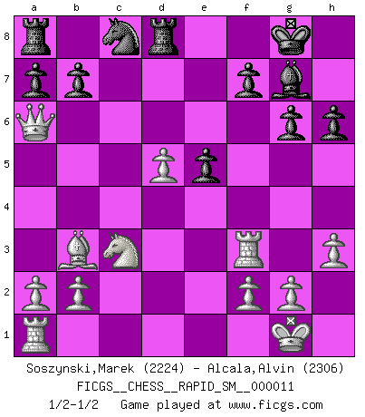 Last move : 1/2-1/2 2014 March 11 16:32:53 [Event "FICGS__CHESS__RAPID_SM__000011"] [Site "FICGS"] [Date "2013.12.26"] [Round "1"] [White "Soszynski,Marek"] [Black "Alcala,Alvin"] [Result "1/2-1/2"] [WhiteElo "2224"] [BlackElo "2306"] 1.d4 Nf6 2.c4 c6 3.Nf3 d5 4.Nc3 e6 5.Bg5 h6 6.Bxf6 Qxf6 7.e3 Nd7 8.Bd3 dxc4 9.Bxc4 g6 10.O-O Bg7 11.Re1 O-O 12.e4 e5 13.d5 Nb6 14.Bb3 Bg4 15.Re3 Rfd8 16.Qe2 cxd5 17.exd5 Nc8 18.h3 Bxf3 19.Rxf3 Qa6 20.Qxa6 1/2-1/2 Queen's pawn game Kingside Castling by player White (move 10) Kingside Castling by player Black (move 11) This chess game ended in a draw. Follow this game move after move (download)Best by test: 1. e4 (Bobby Fischer) Fischer machte Schach einfach zu einer aufregenden Sache, wann immer er sich ans Brett setzte. (Raymond Keene) La señal de un Gran Maestro es su habilidad de ganar una partida rápidamente y sin dolor. (Irving Chernev) RxDa4 pat (...) A woman without a man is like a fish without a bicycle. (Gloria Steinem)