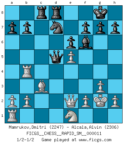 Last move : 1/2-1/2 2014 April 6 5:26:48 [Event "FICGS__CHESS__RAPID_SM__000011"] [Site "FICGS"] [Date "2013.12.26"] [Round "1"] [White "Mamrukov,Dmitri"] [Black "Alcala,Alvin"] [Result "1/2-1/2"] [WhiteElo "2247"] [BlackElo "2306"] 1.d4 Nf6 2.c4 c6 3.Nf3 d5 4.Qc2 dxc4 5.Qxc4 Bf5 6.g3 e6 7.Bg2 Be7 8.O-O O-O 9.e3 Nbd7 10.Rd1 Qa5 11.Qe2 Rac8 12.Nc3 Ne4 13.Nxe4 Bxe4 14.Ne1 Bxg2 15.Kxg2 c5 16.e4 cxd4 17.Rxd4 Rfd8 18.Bd2 Qb6 19.Bc3 Bf6 20.Rb4 Qa5 21.e5 Qd5+ 1/2-1/2 Queen's pawn game Kingside Castling by player White (move 8) Kingside Castling by player Black (move 8) This chess game ended in a draw. Follow this game move after move (download)Chess is a foolish expedient for making idle people believe they are doing something very clever when they are only wasting their time. (George Bernard Shaw) Später, ... hatte ich zunehmend Erfolg in entscheidenden Partien. Vielleicht weil ich eine einfache Wahrheit erkannte: nicht nur ich hatte Angst, auch mein Gegner. (Mikhail Nekhemyevich Tal) El Ajedrez se juega con la mente... ¡no con las manos!. (Renaud y Kahn) Avant la finale, les dieux ont créé le milieu de partie. (Tarrasch) The Internet isn't free. It just has an economy that makes no sense to capitalism. (Brad Shapcott)