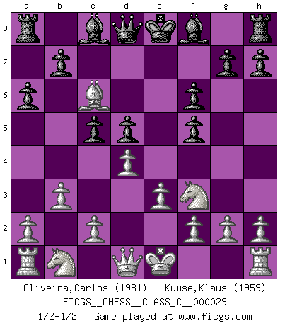 Last move : 1/2-1/2 2007 March 3 9:35:20 [Event "FICGS__CHESS__CLASS_C__000029"] [Site "FICGS"] [Date "2007.02.11"] [Round "1"] [White "Oliveira,Carlos"] [Black "Kuuse,Klaus"] [Result "1/2-1/2"] [WhiteElo "1981"] [BlackElo "1959"] 1.b3 f5 2.Bb2 Nf6 3.Bxf6 exf6 4.d4 d5 5.e3 c5 6.Nf3 Nc6 7.Bb5 a6 8.Bxc6+ 1/2-1/2 Nimzovich-Larsen attack : Dutch variation This chess game ended in a draw. Follow this game move after move (download)A Chess game is a dialogue, a conversation between a player and his opponent. Each move by the opponent may contain threats or be a blunder, but a player cannot defend against threats or take advantage of blunders if he does not first ask himself: What is my opponent planning after each move ? (Bruce A. Moon) In Buenos Aires ist es nicht mein vorrangiges Ziel ein starkes Turnier zu organisieren, sondern ein Turnier für Gentlemen. Ich würde nie Kamsky einladen. Ich mag keine Probleme. (Miguel Najdorf) Una victoria por una combinación errónea, aunque sea espectacular, me llena de horror artístico. (Wilhelm Steinitz) Aux échecs, l'amour-propre est satisfait quand on remporte la victoire, mais il n'y a pas de honte à être battu. (Benjamin Franklin) Yoga is 99% practice and 1% knowledge. (Sri Krishna Pattabhi Jois)