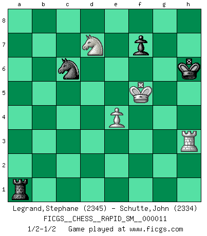 Last move : 1/2-1/2 2014 June 12 3:42:14 [Event "FICGS__CHESS__RAPID_SM__000011"] [Site "FICGS"] [Date "2013.12.26"] [Round "1"] [White "Legrand,Stephane"] [Black "Schutte,John"] [Result "1/2-1/2"] [WhiteElo "2345"] [BlackElo "2334"] 1.d4 d5 2.c4 c6 3.Nc3 Nf6 4.Nf3 e6 5.e3 Nbd7 6.Qc2 Bd6 7.Be2 O-O 8.O-O dxc4 9.Bxc4 b5 10.Be2 Bb7 11.e4 e5 12.dxe5 Nxe5 13.Nd4 Neg4 14.g3 Bxg3 15.hxg3 Qxd4 16.Qd1 Qxd1 17.Rxd1 Rfe8 18.f3 Ne5 19.Be3 Rad8 20.Rxd8 Rxd8 21.Bxa7 b4 22.Nd1 Ra8 23.Bc5 Ba6 24.Kf2 Bxe2 25.Kxe2 Nh5 26.Bf2 g6 27.Ne3 Ng7 28.f4 Nd7 29.Nc4 Ne6 30.Kf3 h5 31.Be3 Nec5 32.a3 Ra6 33.Rd1 bxa3 34.bxa3 g5 35.fxg5 Ra4 36.Nb6 Ne5+ 37.Ke2 Ra5 38.Bxc5 Rxc5 39.a4 Kg7 40.Ra1 Ra5 41.Rf1 c5 42.Rb1 Nc6 43.Kd3 c4+ 44.Kxc4 Rxg5 45.Rb5 Na5+ 46.Kd3 Rxg3+ 47.Ke2 Nb3 48.Rxh5 Rc3 49.Rd5 Rc6 50.Nd7 Ra6 51.Ke3 Rxa4 52.Rd3 Na5 53.Kf4 Nc6 54.Rg3+ Kh6 55.Kf5 Ra1 56.Rh3+ 1/2-1/2 QGD Slav defense Kingside Castling by player Black (move 7) Kingside Castling by player White (move 8) 10 pieces endgame at move 46 : White KRNPP , Black KRNPP WHITE : King + 1 Rook 1 Knight 2 Pawns BLACK : King + 1 Rook 1 Knight 2 Pawns 9 pieces endgame at move 48 : White KRNPP , Black KRNP WHITE : King + 1 Rook 1 Knight 2 Pawns BLACK : King + 1 Rook 1 Knight 1 Pawn 8 pieces endgame at move 51 : White KRNP , Black KRNP WHITE : King + 1 Rook 1 Knight 1 Pawn BLACK : King + 1 Rook 1 Knight 1 Pawn This chess game ended in a draw. Follow this game move after move (download)It is the aim of the modern school, not to treat every position according to one general law, but according to the principle inherent in the position. (Richard Reti) Ich rechne überhaupt nicht voraus. Ich gewinne auch so. (Robert James Fischer) Por la belleza de sus partidas, la claridad de su juego y lo brillante de sus ideas, Fischer se creó el mismo como un artista de la misma estatura como Brahms, Rembrandt y Shakespeare. (David Levy) L'ordinateur a tué l'originalité. Il n'y a plus guère d'aventures sur l'échiquier. (Jacob Murray) The good fighters of old first put themselves beyond the possibility of defeat, and then waited for an opportunity of defeating the enemy. (Sun Tzu)