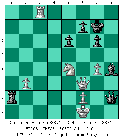 Last move : 1/2-1/2 2014 March 27 7:53:11 [Event "FICGS__CHESS__RAPID_SM__000011"] [Site "FICGS"] [Date "2013.12.26"] [Round "1"] [White "Shwimmer,Peter"] [Black "Schutte,John"] [Result "1/2-1/2"] [WhiteElo "2387"] [BlackElo "2334"] 1.e4 c5 2.c3 Nf6 3.e5 Nd5 4.Nf3 d6 5.d4 cxd4 6.exd6 e6 7.Bb5+ Bd7 8.Bxd7+ Qxd7 9.c4 Nf6 10.O-O Bxd6 11.Qxd4 Nc6 12.Qe3 O-O 13.Nc3 Rad8 14.Qe2 Ng4 15.Ng5 Nh6 16.Rd1 Qe7 17.Qe4 Nf5 18.Nd5 Qd7 19.Nc3 Qc8 20.b3 Be7 21.Nf3 Rxd1+ 22.Nxd1 Rd8 23.Bb2 Nb4 24.Ba3 a5 25.h3 Qa8 26.Nc3 Bf6 27.Rc1 h5 28.Bxb4 axb4 29.Na4 g6 30.Qe1 Qa5 31.a3 Be7 32.axb4 Bxb4 33.Qe4 b5 34.cxb5 Qxb5 35.g4 hxg4 36.hxg4 Ne7 37.Nd4 Qg5 38.Rc4 Bd6 39.Nc3 Qf6 40.Qf3 Qh4 41.Nc6 Nxc6 42.Rxc6 Qh2+ 43.Kf1 Be7 44.Rc4 Rd2 45.Ne4 Ra2 46.Rc8+ Kg7 47.Re8 Bh4 48.Rc8 1/2-1/2 Sicilian : Alapin's variation (2.c3) Kingside Castling by player White (move 10) Kingside Castling by player Black (move 12) This chess game ended in a draw. Follow this game move after move (download)Chess books should be used as we use glasses: to assist the sight, although some players make use of them as if they thought they conferred sight. (Jose Raul Capablanca) Wenn sie aufgeben, dann danke ich Ihnen für das Spiel (Eventualzug beim Fernschach). (Anonymous) El Ajedrez no es como la vida... ¡tiene reglas!. (Mark Pasternak) Vouloir jouer aux échecs contre soi-même est aussi paradoxal que vouloir marcher sur son ombre. (Stefan Zweig) It's not the size of the dog in the fight, it's the size of the fight in the dog. (Mark Twain)